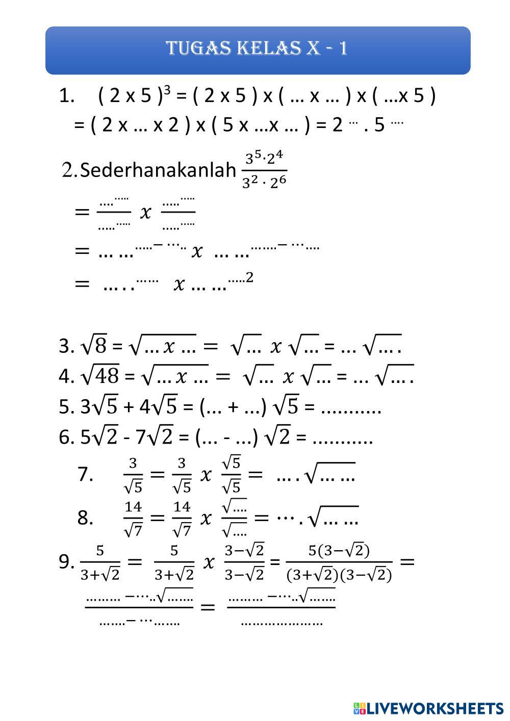 Created by matematikaxi MATEMATIKA WAJIB pangkat Edad 16+ level: x Indonesian Instrucciones del autor ok My Google Classroom Courses × 0 classes selected (0 students total) Quick Access Select all classes (0 classes) All Classes Loading courses... Cancelar Share Share to selected Course __COURSE_NAME__ __STUDENT_NAME__ (__STUDENT_EMAIL__) pangkat kelas x Descargar Worksheet Validation Comprobar mis respuestas Emails my answers to my teacher Nombre completo Group/level Asignatura Teacher's email or key code Close Submit Validating worksheet... (12) Your answers have been sent to your teacher. Good luck! OK We encountered an error submitting your answers. Please try again. OK Anuncio | Ir sin anuncios Created by matematikaxi MATEMATIKA WAJIB pangkat Edad 16+ level: x Indonesian Instrucciones del autor ok