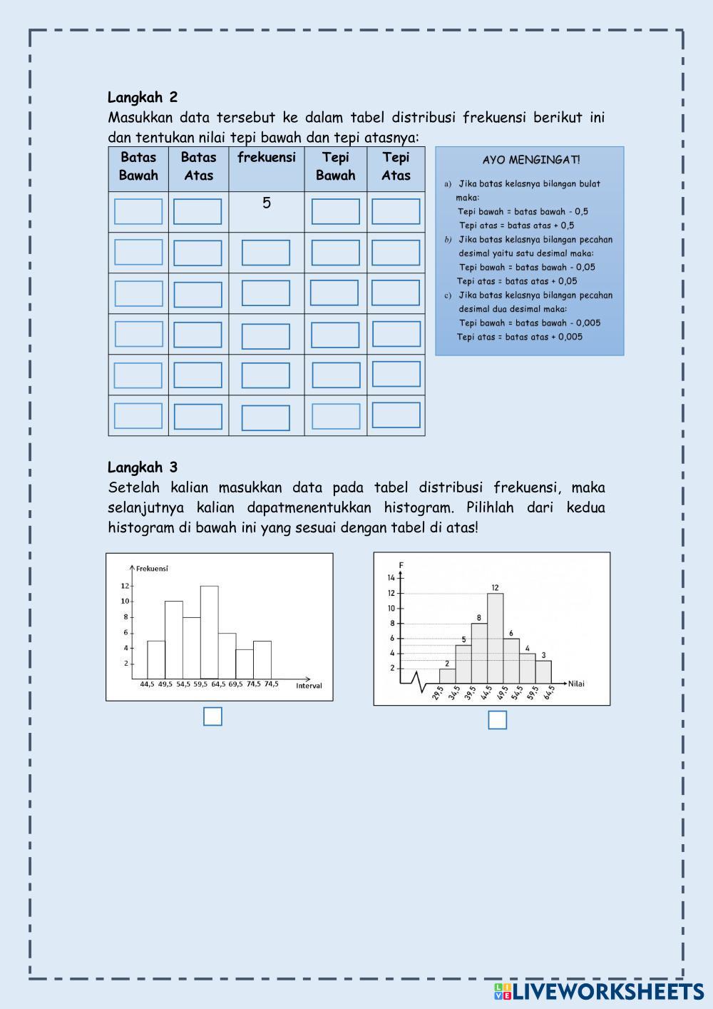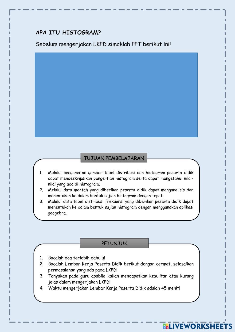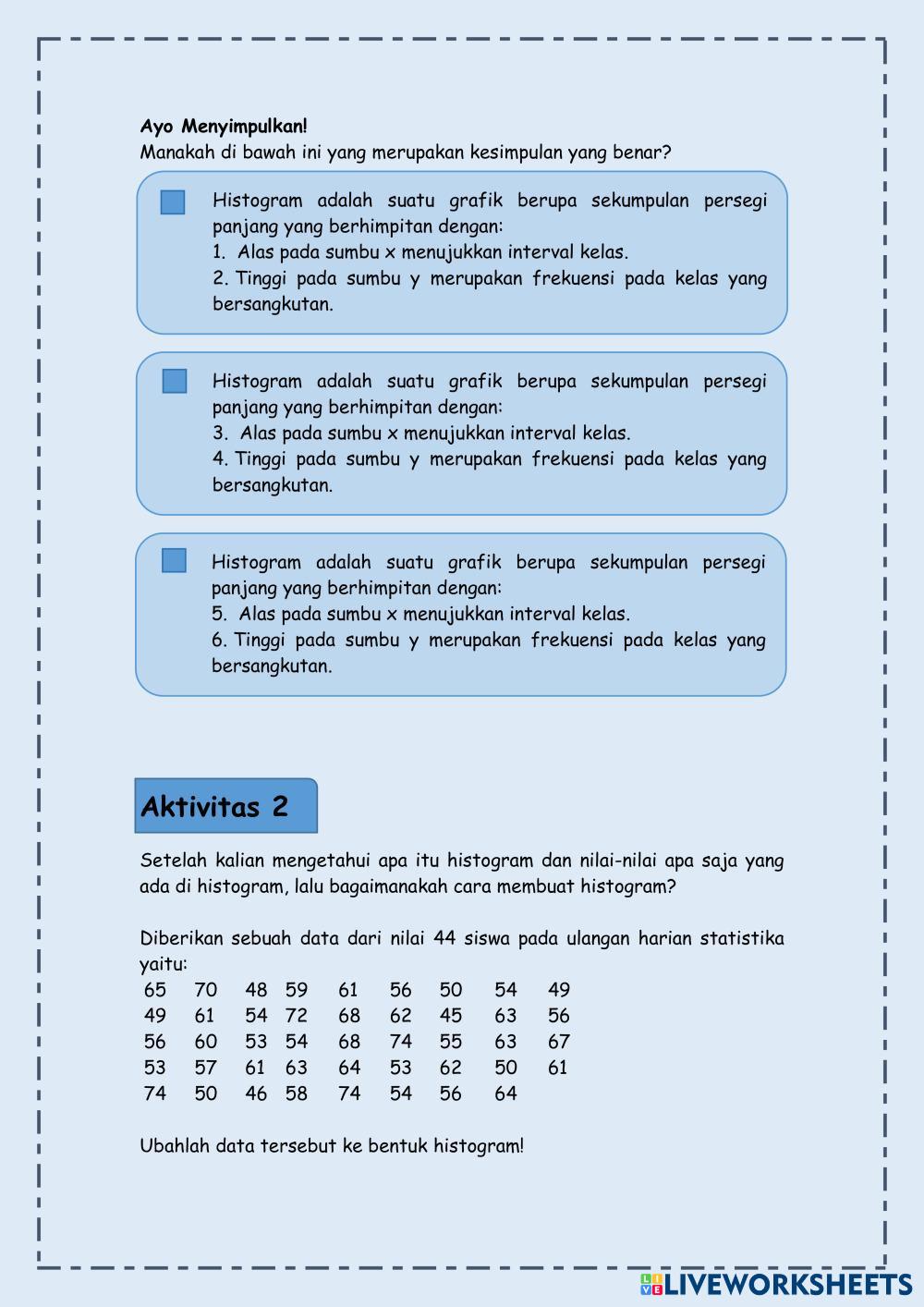 Created byErnia Tyas Inggriastri MATEMATIKA WAJIB Statistika Edad 17+ level: 12 Indonesian Instrucciones del autor Statistika My Google Classroom Courses × 0 classes selected (0 students total) Quick Access Select all classes (0 classes) All Classes Loading courses... Cancelar Share Share to selected Course __COURSE_NAME__ __STUDENT_NAME__ (__STUDENT_EMAIL__) Statistika Sajian Data Histogram Descargar Worksheet Validation Comprobar mis respuestas Emails my answers to my teacher Nombre completo Group/level Asignatura Teacher's email or key code Close Submit Validating worksheet... (12) Your answers have been sent to your teacher. Good luck! OK We encountered an error submitting your answers. Please try again. OK Anuncio | Ir sin anuncios Created byErnia Tyas Inggriastri MATEMATIKA WAJIB Statistika Edad 17+ level: 12 Indonesian Instrucciones del autor Statistika