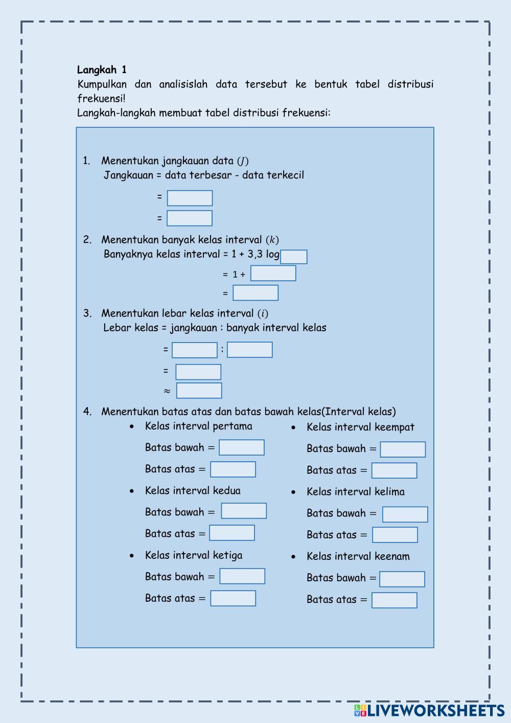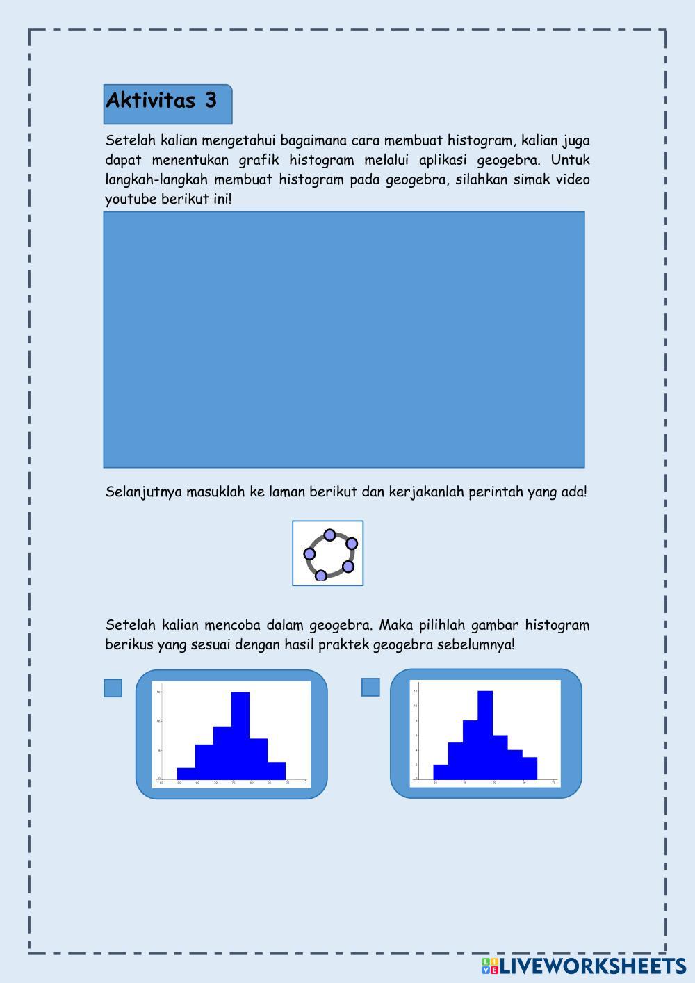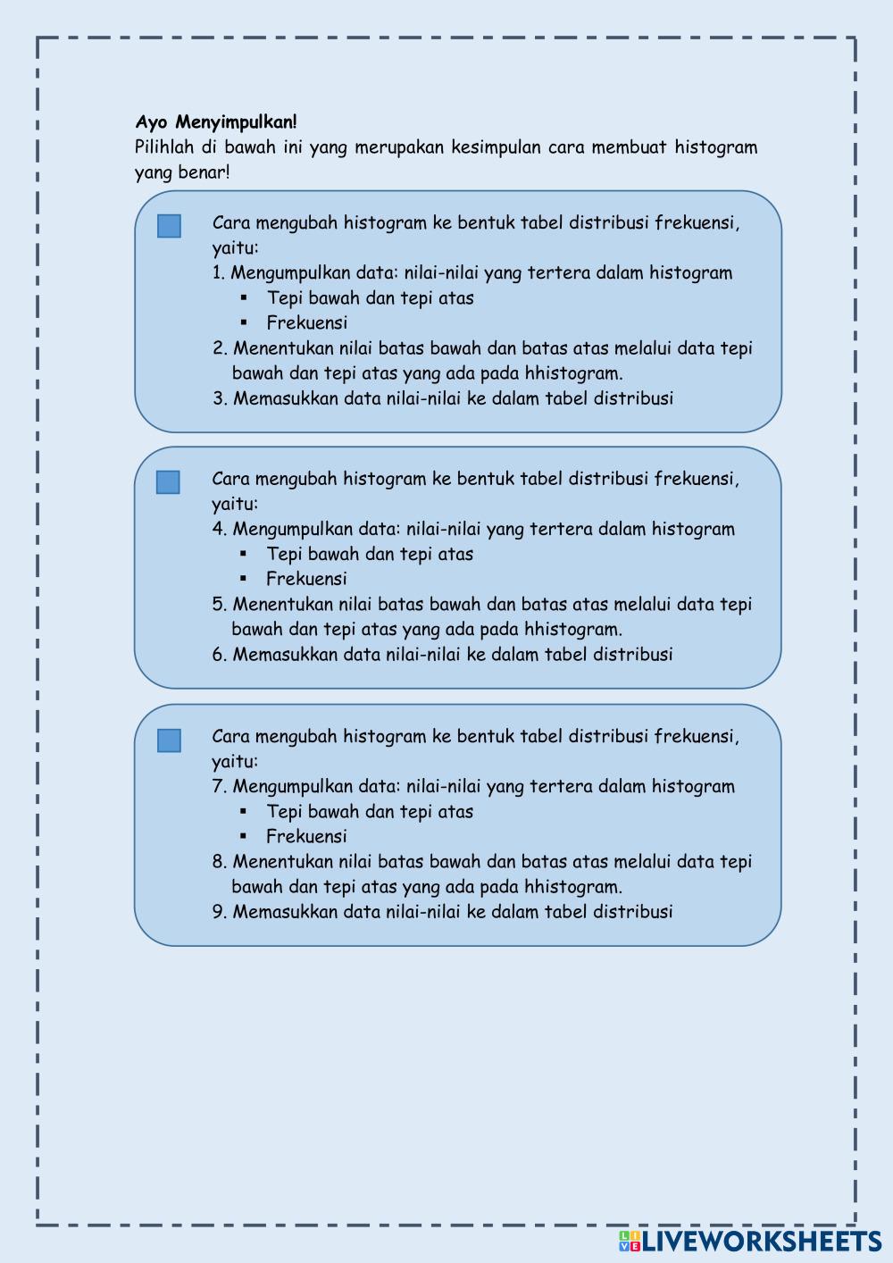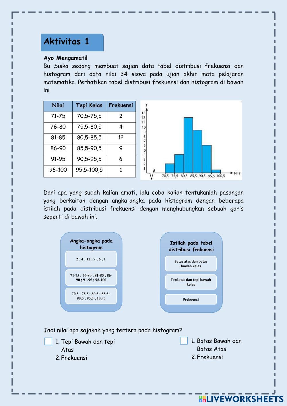 Created byErnia Tyas Inggriastri MATEMATIKA WAJIB Statistika Edad 17+ level: 12 Indonesian Instrucciones del autor Statistika My Google Classroom Courses × 0 classes selected (0 students total) Quick Access Select all classes (0 classes) All Classes Loading courses... Cancelar Share Share to selected Course __COURSE_NAME__ __STUDENT_NAME__ (__STUDENT_EMAIL__) Statistika Sajian Data Histogram Descargar Worksheet Validation Comprobar mis respuestas Emails my answers to my teacher Nombre completo Group/level Asignatura Teacher's email or key code Close Submit Validating worksheet... (12) Your answers have been sent to your teacher. Good luck! OK We encountered an error submitting your answers. Please try again. OK Anuncio | Ir sin anuncios Created byErnia Tyas Inggriastri MATEMATIKA WAJIB Statistika Edad 17+ level: 12 Indonesian Instrucciones del autor Statistika