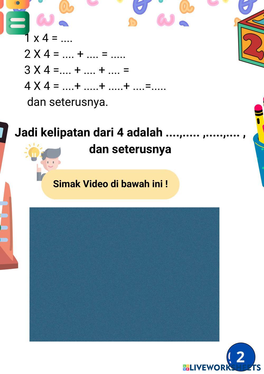 Created byCharoline Tata Indrian Matematika Kpk Edad 8-14 level: 3 Indonesian Instrucciones del autor My Google Classroom Courses × 0 classes selected (0 students total) Quick Access Select all classes (0 classes) All Classes Loading courses... Cancelar Share Share to selected Course __COURSE_NAME__ __STUDENT_NAME__ (__STUDENT_EMAIL__) KPK ( Kelipatan Persekutuan Terkecil) Descargar Worksheet Validation Comprobar mis respuestas Emails my answers to my teacher Nombre completo Group/level Asignatura Teacher's email or key code Close Submit Validating worksheet... (12) Your answers have been sent to your teacher. Good luck! OK We encountered an error submitting your answers. Please try again. OK Anuncio | Ir sin anuncios Created byCharoline Tata Indrian Matematika Kpk Edad 8-14 level: 3 Indonesian Instrucciones del autor