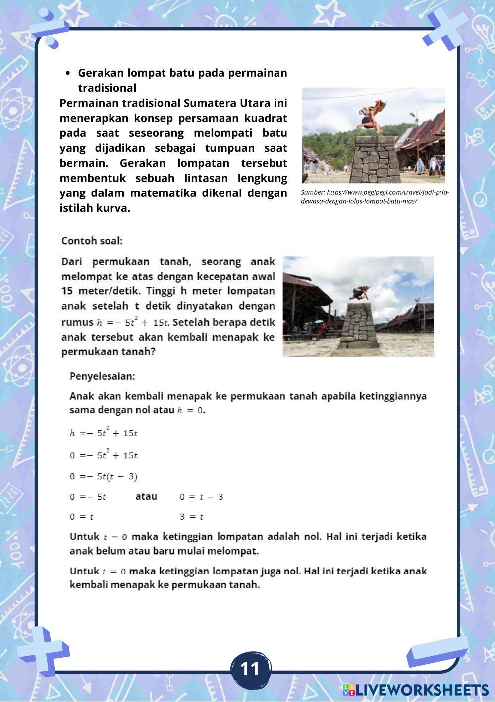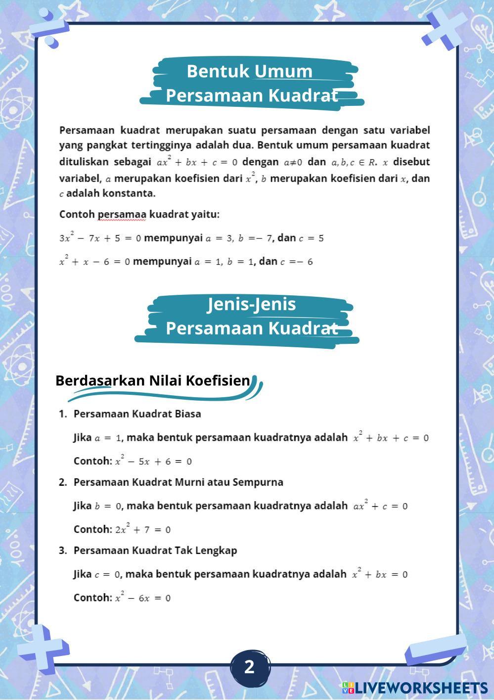 Dalam modul ini terdapat beberapa sajian materi yang dikemas semenarik mungkin menggunakan teks, gambar maupun video, kuis interaktif berkaitan dengan "Persamaan Kuadrat". Selain itu penulis juga menyisipkan video pembelajaran melalui link youtube terkait dengan materi persamaan kuadrat. Penulis berusaha menyusun modul Matematika ini sesuai dengan kebutuhan peserta didik dan pendidik sehingga dapat terjadi kegiatan belajar mengajar yang lebih interaktif.