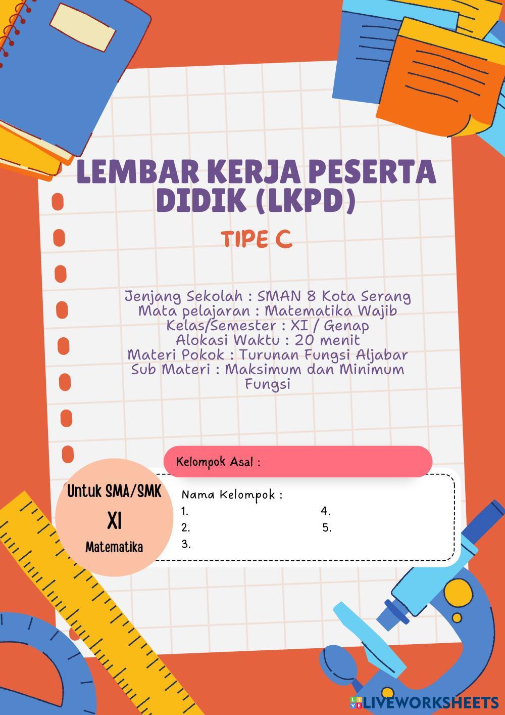 Created byUmroh Uum Matematika Turunan Fungsi Aljabar Edad 14+ level: 11 Indonesian Instrucciones del autor My Google Classroom Courses × 0 classes selected (0 students total) Quick Access Select all classes (0 classes) All Classes Loading courses... Cancelar Share Share to selected Course __COURSE_NAME__ __STUDENT_NAME__ (__STUDENT_EMAIL__) LKPD Maksimum Minimum Turunan Tipe C Descargar Worksheet Validation Comprobar mis respuestas Emails my answers to my teacher Nombre completo Group/level Asignatura Teacher's email or key code Close Submit Validating worksheet... (12) Your answers have been sent to your teacher. Good luck! OK We encountered an error submitting your answers. Please try again. OK Anuncio | Ir sin anuncios Created byUmroh Uum Matematika Turunan Fungsi Aljabar Edad 14+ level: 11 Indonesian Instrucciones del autor