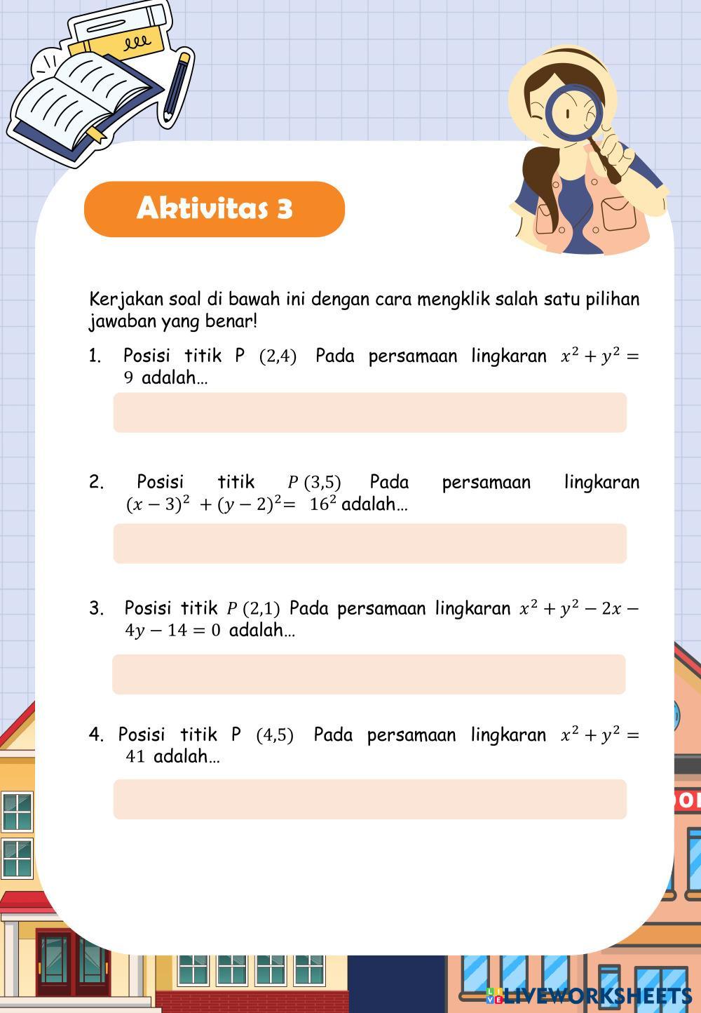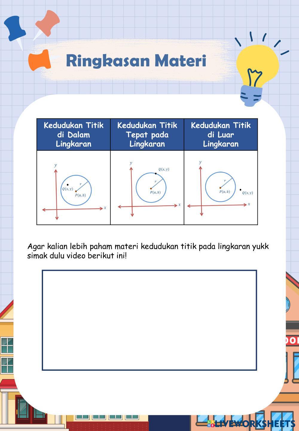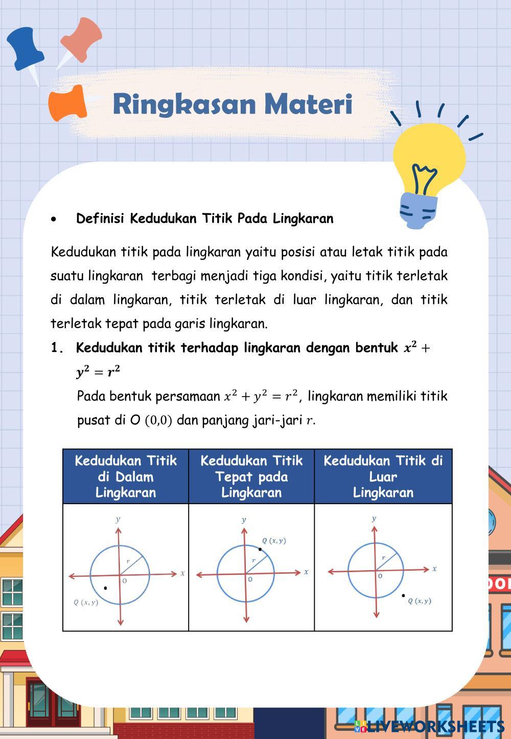Created byEggy Anggraini Matematika Kedudukan titik terhadap lingkaran Edad 10+ level: SMA Indonesian Instrucciones del autor My Google Classroom Courses × 0 classes selected (0 students total) Quick Access Select all classes (0 classes) All Classes Loading courses... Cancelar Share Share to selected Course __COURSE_NAME__ __STUDENT_NAME__ (__STUDENT_EMAIL__) KEDUDUKAN TITIK PADA LINGKARAN Descargar Worksheet Validation Comprobar mis respuestas Emails my answers to my teacher Nombre completo Group/level Asignatura Teacher's email or key code Close Submit Validating worksheet... (12) Your answers have been sent to your teacher. Good luck! OK We encountered an error submitting your answers. Please try again. OK Anuncio | Ir sin anuncios Created byEggy Anggraini Matematika Kedudukan titik terhadap lingkaran Edad 10+ level: SMA Indonesian Instrucciones del autor