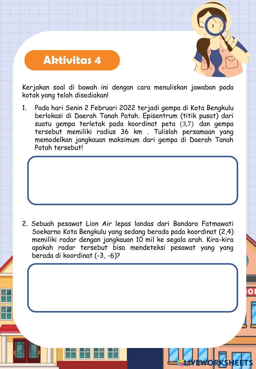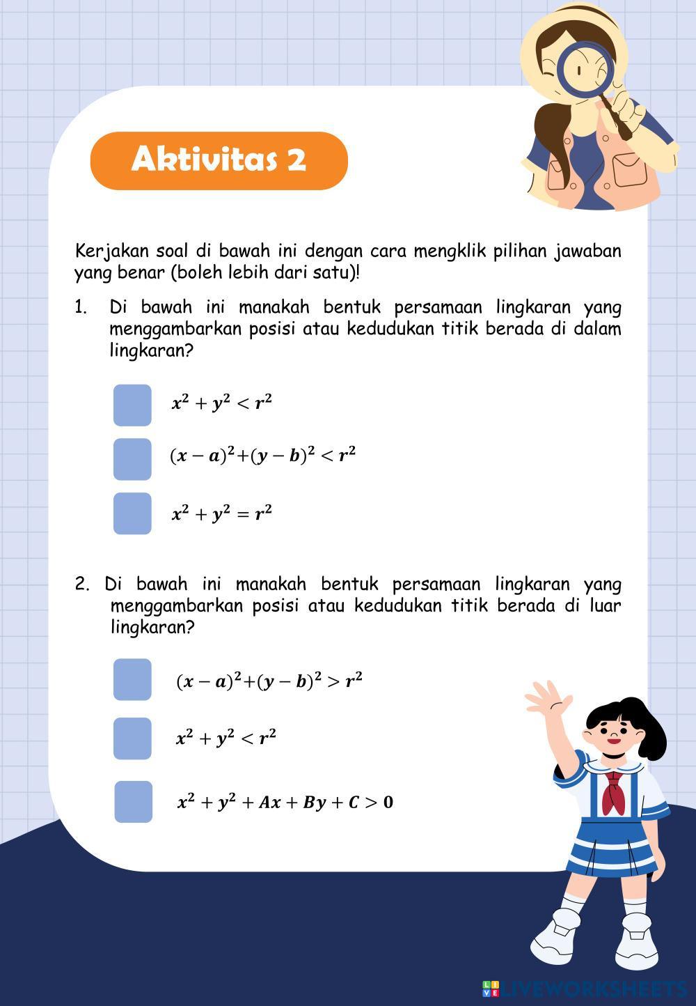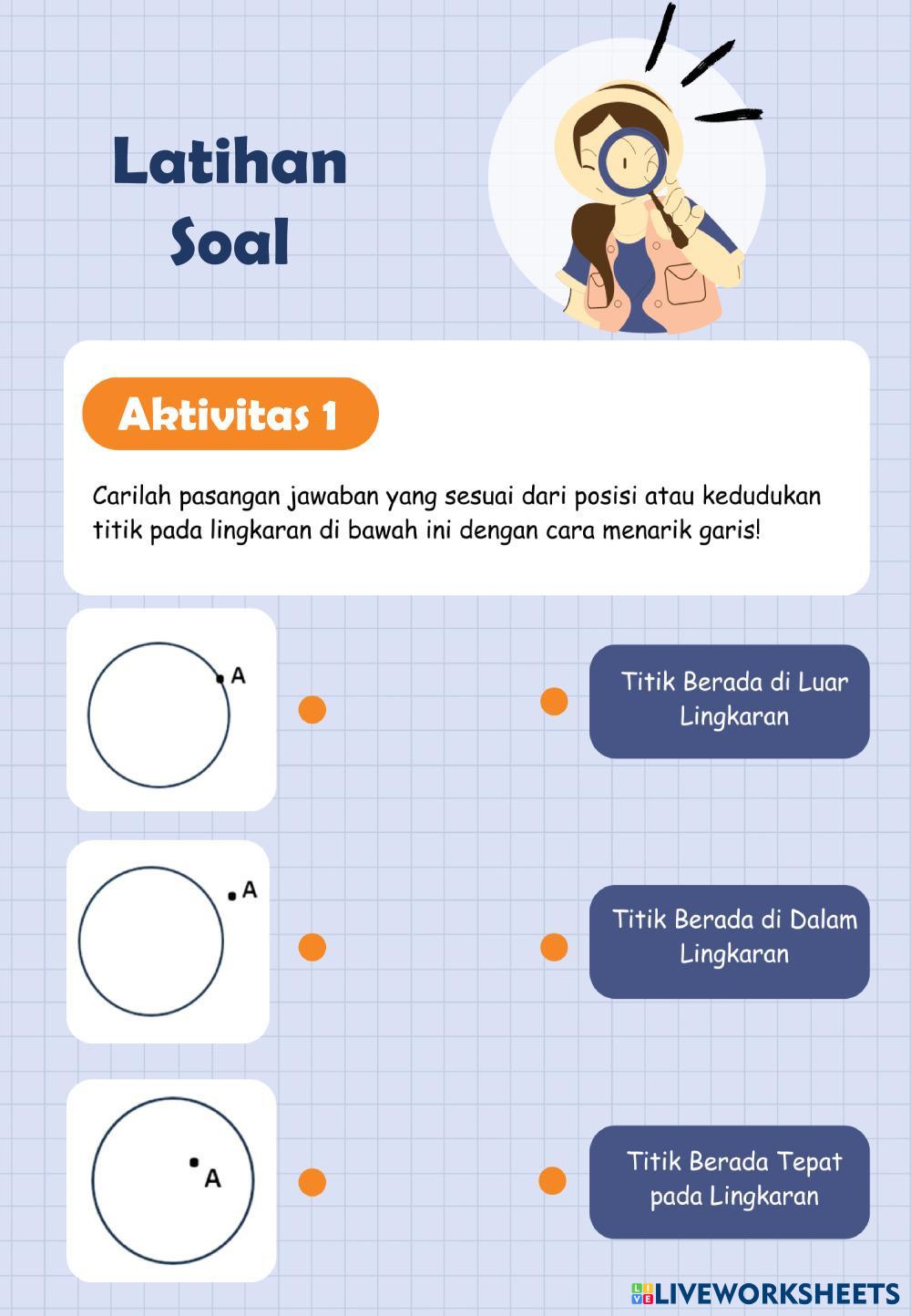 Created byEggy Anggraini Matematika Kedudukan titik terhadap lingkaran Edad 10+ level: SMA Indonesian Instrucciones del autor My Google Classroom Courses × 0 classes selected (0 students total) Quick Access Select all classes (0 classes) All Classes Loading courses... Cancelar Share Share to selected Course __COURSE_NAME__ __STUDENT_NAME__ (__STUDENT_EMAIL__) KEDUDUKAN TITIK PADA LINGKARAN Descargar Worksheet Validation Comprobar mis respuestas Emails my answers to my teacher Nombre completo Group/level Asignatura Teacher's email or key code Close Submit Validating worksheet... (12) Your answers have been sent to your teacher. Good luck! OK We encountered an error submitting your answers. Please try again. OK Anuncio | Ir sin anuncios Created byEggy Anggraini Matematika Kedudukan titik terhadap lingkaran Edad 10+ level: SMA Indonesian Instrucciones del autor