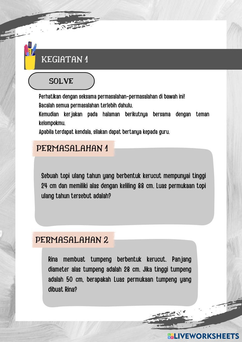 Created byChafidz Farchudin Matematika Luas permukaan kerucut Edad 13-18 level: 2 Indonesian Instrucciones del autor My Google Classroom Courses × 0 classes selected (0 students total) Quick Access Select all classes (0 classes) All Classes Loading courses... Cancelar Share Share to selected Course __COURSE_NAME__ __STUDENT_NAME__ (__STUDENT_EMAIL__) E-LKPD Lp Kerucut K2 Descargar Worksheet Validation Comprobar mis respuestas Emails my answers to my teacher Nombre completo Group/level Asignatura Teacher's email or key code Close Submit Validating worksheet... (12) Your answers have been sent to your teacher. Good luck! OK We encountered an error submitting your answers. Please try again. OK Anuncio | Ir sin anuncios Created byChafidz Farchudin Matematika Luas permukaan kerucut Edad 13-18 level: 2 Indonesian Instrucciones del autor