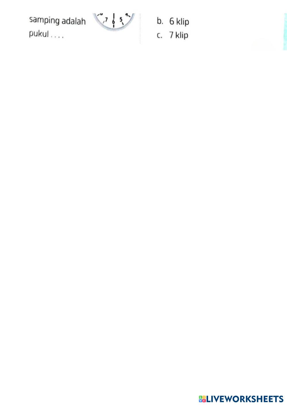 Created byAnna Pertiwi Matematika Latihan soal matematika Edad 8-13 level: 2 Indonesian Instrucciones del autor My Google Classroom Courses × 0 classes selected (0 students total) Quick Access Select all classes (0 classes) All Classes Loading courses... Cancelar Share Share to selected Course __COURSE_NAME__ __STUDENT_NAME__ (__STUDENT_EMAIL__) kelas 2 PAS semester 1 Descargar Worksheet Validation Comprobar mis respuestas Emails my answers to my teacher Nombre completo Group/level Asignatura Teacher's email or key code Close Submit Validating worksheet... (12) Your answers have been sent to your teacher. Good luck! OK We encountered an error submitting your answers. Please try again. OK Anuncio | Ir sin anuncios Created byAnna Pertiwi Matematika Latihan soal matematika Edad 8-13 level: 2 Indonesian Instrucciones del autor