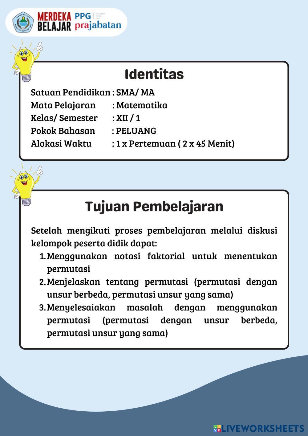 Created byPUTERI RAKHMA Matematika Permutasi Edad 16+ level: 12 Indonesian Instrucciones del autor My Google Classroom Courses × 0 classes selected (0 students total) Quick Access Select all classes (0 classes) All Classes Loading courses... Cancelar Share Share to selected Course __COURSE_NAME__ __STUDENT_NAME__ (__STUDENT_EMAIL__) Permutasi Descargar Worksheet Validation Comprobar mis respuestas Emails my answers to my teacher Nombre completo Group/level Asignatura Teacher's email or key code Close Submit Validating worksheet... (12) Your answers have been sent to your teacher. Good luck! OK We encountered an error submitting your answers. Please try again. OK Anuncio | Ir sin anuncios Created byPUTERI RAKHMA Matematika Permutasi Edad 16+ level: 12 Indonesian Instrucciones del autor