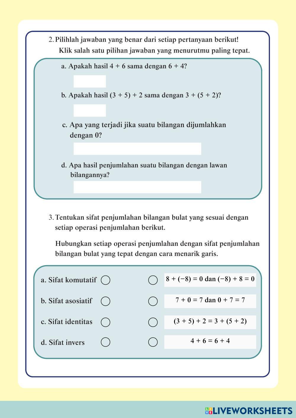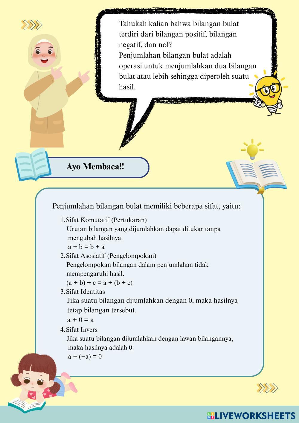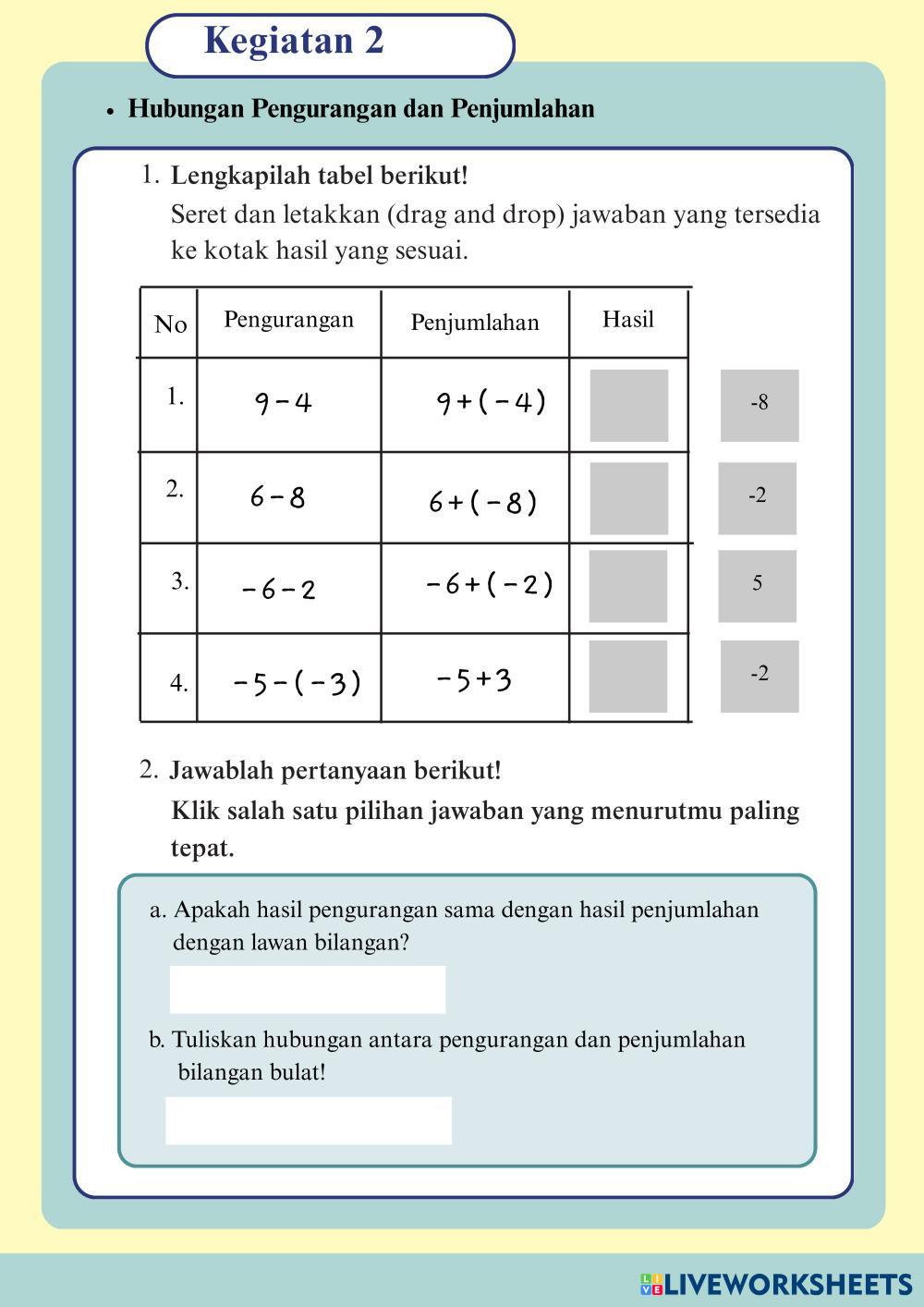 Created by baiqika Matemáticas Educación Secundaria Obligatoria 6º de Primaria Álgebra Indonesian Instrucciones del autor Kerjakan LKPD berikut My Google Classroom Courses × 0 classes selected (0 students total) Quick Access Select all classes (0 classes) All Classes Loading courses... Cancelar Share Share to selected Course __COURSE_NAME__ __STUDENT_NAME__ (__STUDENT_EMAIL__) Bilangan Bulat Descargar Worksheet Validation Comprobar mis respuestas Emails my answers to my teacher Nombre completo Group/level Asignatura Teacher's email or key code Close Submit Validating worksheet... (12) Your answers have been sent to your teacher. Good luck! OK We encountered an error submitting your answers. Please try again. OK Anuncio | Ir sin anuncios Created by baiqika Matemáticas Educación Secundaria Obligatoria 6º de Primaria Álgebra Indonesian Instrucciones del autor Kerjakan LKPD berikut Explora las hojas de trabajo 5/6.5aa Math 6th grade 5/6.5aa Algebra - Math drug and drop ايجاد قاعدة دالة Math 6th grade ايجاد قاعدة دالة Algebra - Math جد قاعدة الدالة ثم جد الحد المطلوب 5/6.5a Math 6th grade 5/6.5a Algebra - Math no M7L1 - Exit Ticket Math 6th grade M7L1 - Exit Ticket Algebra - Math Fill the table with the correct answers