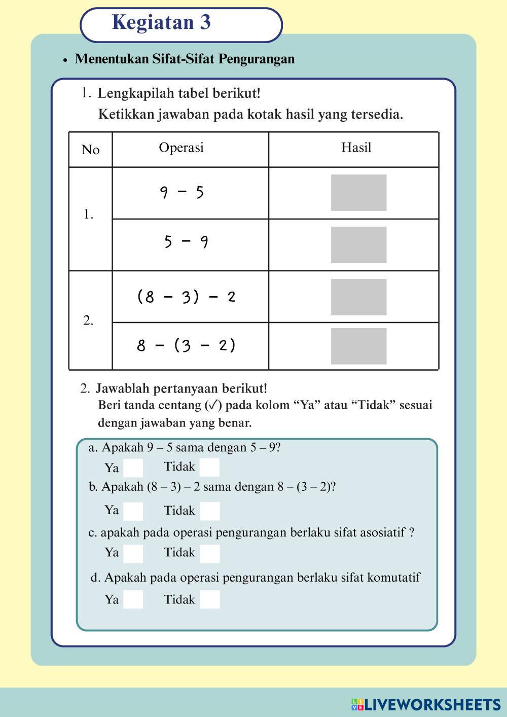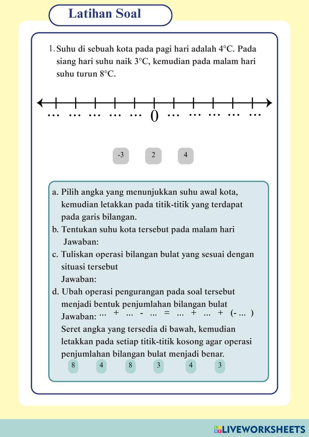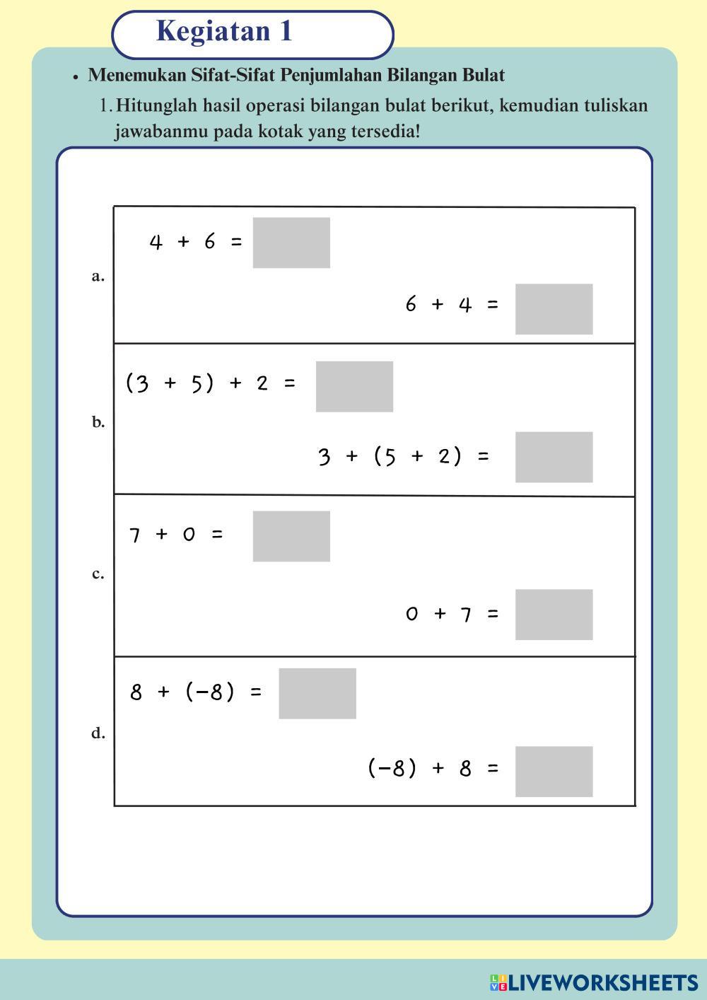 Created by baiqika Matemáticas Educación Secundaria Obligatoria 6º de Primaria Álgebra Indonesian Instrucciones del autor Kerjakan LKPD berikut My Google Classroom Courses × 0 classes selected (0 students total) Quick Access Select all classes (0 classes) All Classes Loading courses... Cancelar Share Share to selected Course __COURSE_NAME__ __STUDENT_NAME__ (__STUDENT_EMAIL__) Bilangan Bulat Descargar Worksheet Validation Comprobar mis respuestas Emails my answers to my teacher Nombre completo Group/level Asignatura Teacher's email or key code Close Submit Validating worksheet... (12) Your answers have been sent to your teacher. Good luck! OK We encountered an error submitting your answers. Please try again. OK Anuncio | Ir sin anuncios Created by baiqika Matemáticas Educación Secundaria Obligatoria 6º de Primaria Álgebra Indonesian Instrucciones del autor Kerjakan LKPD berikut Explora las hojas de trabajo 5/6.5aa Math 6th grade 5/6.5aa Algebra - Math drug and drop ايجاد قاعدة دالة Math 6th grade ايجاد قاعدة دالة Algebra - Math جد قاعدة الدالة ثم جد الحد المطلوب 5/6.5a Math 6th grade 5/6.5a Algebra - Math no M7L1 - Exit Ticket Math 6th grade M7L1 - Exit Ticket Algebra - Math Fill the table with the correct answers