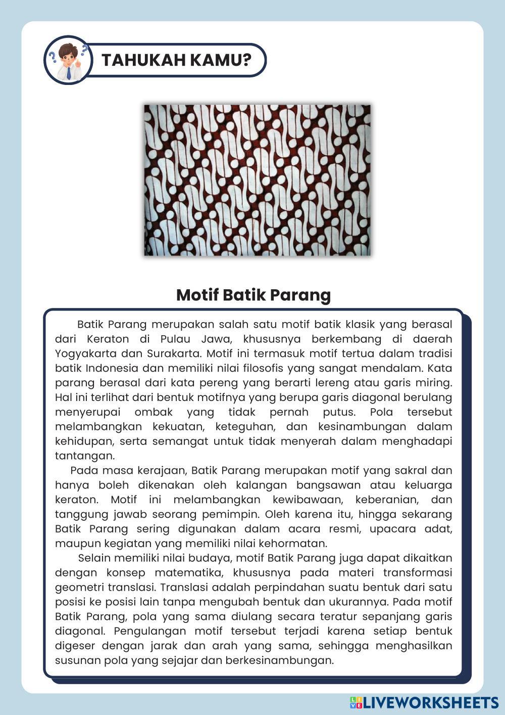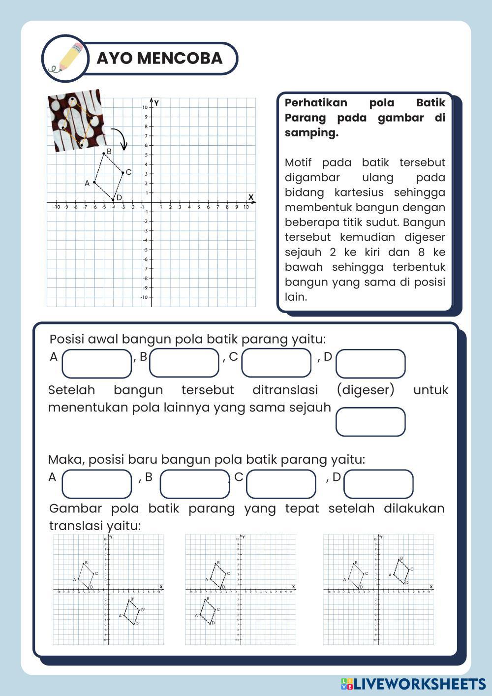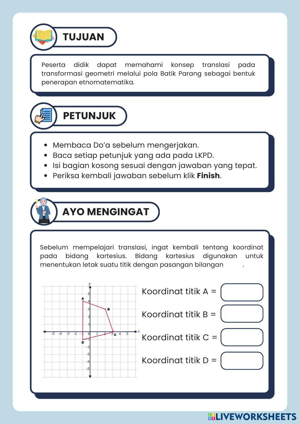 Created by violiamuffadila Matemáticas Educación Secundaria Obligatoria 2º de ESO Geometría Indonesian Instrucciones del autor Translasi Etnomatematika My Google Classroom Courses × 0 classes selected (0 students total) Quick Access Select all classes (0 classes) All Classes Loading courses... Cancelar Share Share to selected Course __COURSE_NAME__ __STUDENT_NAME__ (__STUDENT_EMAIL__) Translasi Descargar Worksheet Validation Comprobar mis respuestas Emails my answers to my teacher Nombre completo Group/level Asignatura Teacher's email or key code Close Submit Validating worksheet... (12) Your answers have been sent to your teacher. Good luck! OK We encountered an error submitting your answers. Please try again. OK Anuncio | Ir sin anuncios Created by violiamuffadila Matemáticas Educación Secundaria Obligatoria 2º de ESO Geometría Indonesian Instrucciones del autor Translasi Etnomatematika Explora las hojas de trabajo S Math 8th grade S Geometry - Math Sumas Translasi Math 8th grade Translasi Geometry - Math translasi etnomatematika דמיון משולשים Math 8th grade דמיון משולשים Geometry - Math לפתור את השאלות הבאות דמיון משולשים Math 8th grade דמיון משולשים Geometry - Math לפתור את השאלות