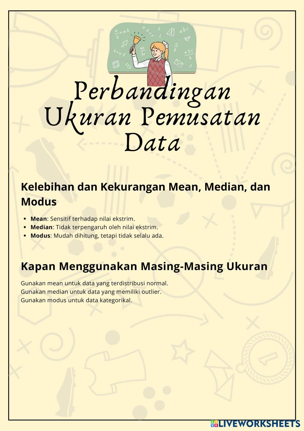 - Bacalah pengantar mengenai ukuran pemusatan data yang terdapat di buku teks atau sumber yang telah disediakan.
