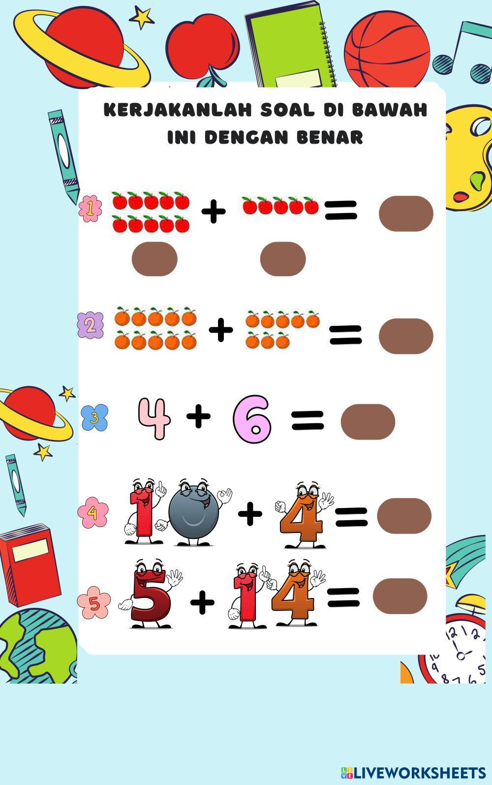 Created byjalmo murid MATEMATIKA Edad 6-10 level: 1 Indonesian Instrucciones del autor My Google Classroom Courses × 0 classes selected (0 students total) Quick Access Select all classes (0 classes) All Classes Loading courses... Cancelar Share Share to selected Course __COURSE_NAME__ __STUDENT_NAME__ (__STUDENT_EMAIL__) PENJUMLAHAN Descargar Worksheet Validation Comprobar mis respuestas Emails my answers to my teacher Nombre completo Group/level Asignatura Teacher's email or key code Close Submit Validating worksheet... (12) Your answers have been sent to your teacher. Good luck! OK We encountered an error submitting your answers. Please try again. OK Anuncio | Ir sin anuncios Created byjalmo murid MATEMATIKA Edad 6-10 level: 1 Indonesian Instrucciones del autor