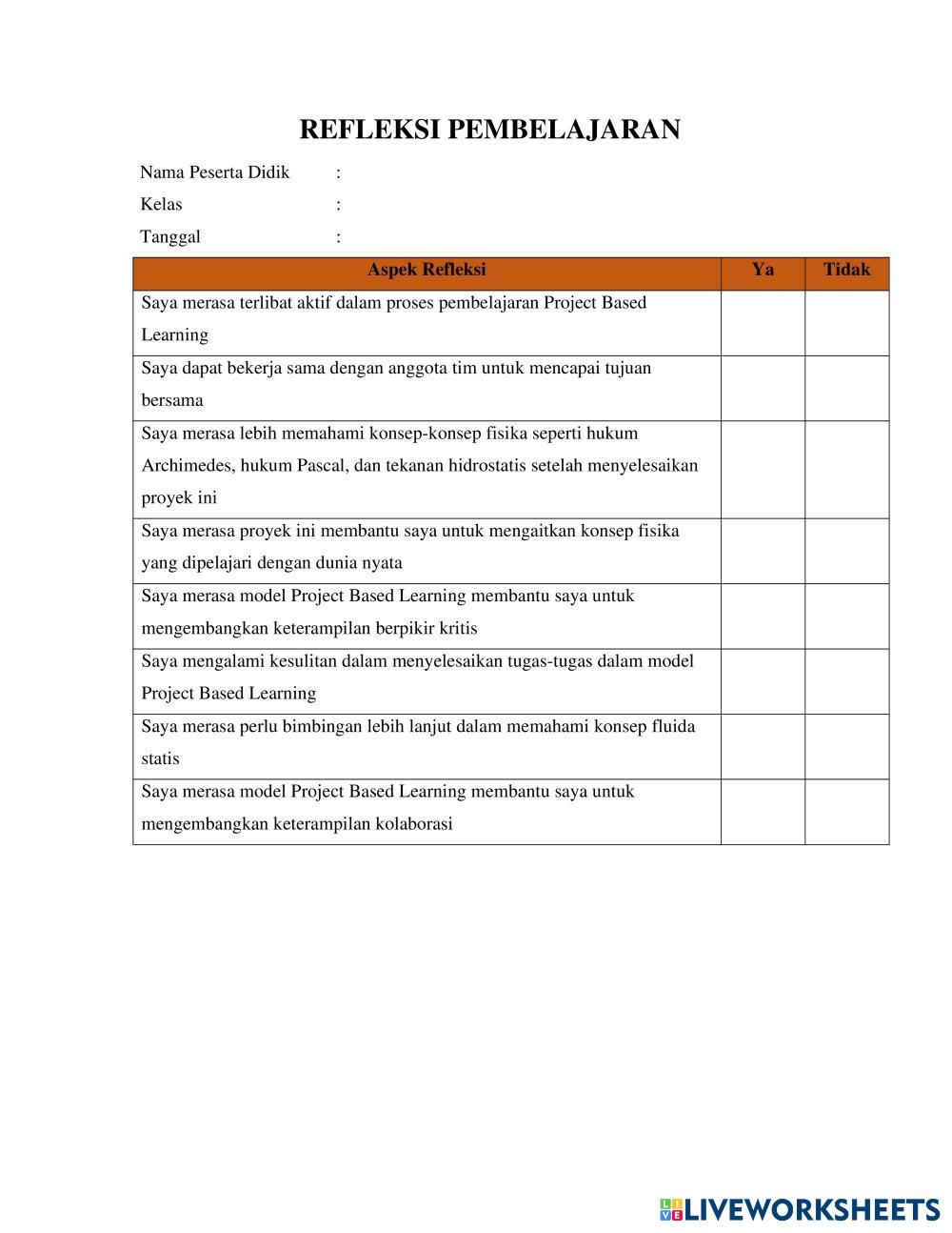 Created byAnggita Physics Education Fluida Edad 16+ level: XI Fase F Indonesian Instrucciones del autor My Google Classroom Courses × 0 classes selected (0 students total) Quick Access Select all classes (0 classes) All Classes Loading courses... Cancelar Share Share to selected Course __COURSE_NAME__ __STUDENT_NAME__ (__STUDENT_EMAIL__) Lembar Refleksi Fluida Statis Descargar Worksheet Validation Comprobar mis respuestas Emails my answers to my teacher Nombre completo Group/level Asignatura Teacher's email or key code Close Submit Validating worksheet... (12) Your answers have been sent to your teacher. Good luck! OK We encountered an error submitting your answers. Please try again. OK Anuncio | Ir sin anuncios Created byAnggita Physics Education Fluida Edad 16+ level: XI Fase F Indonesian Instrucciones del autor