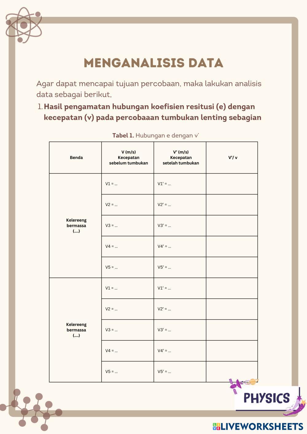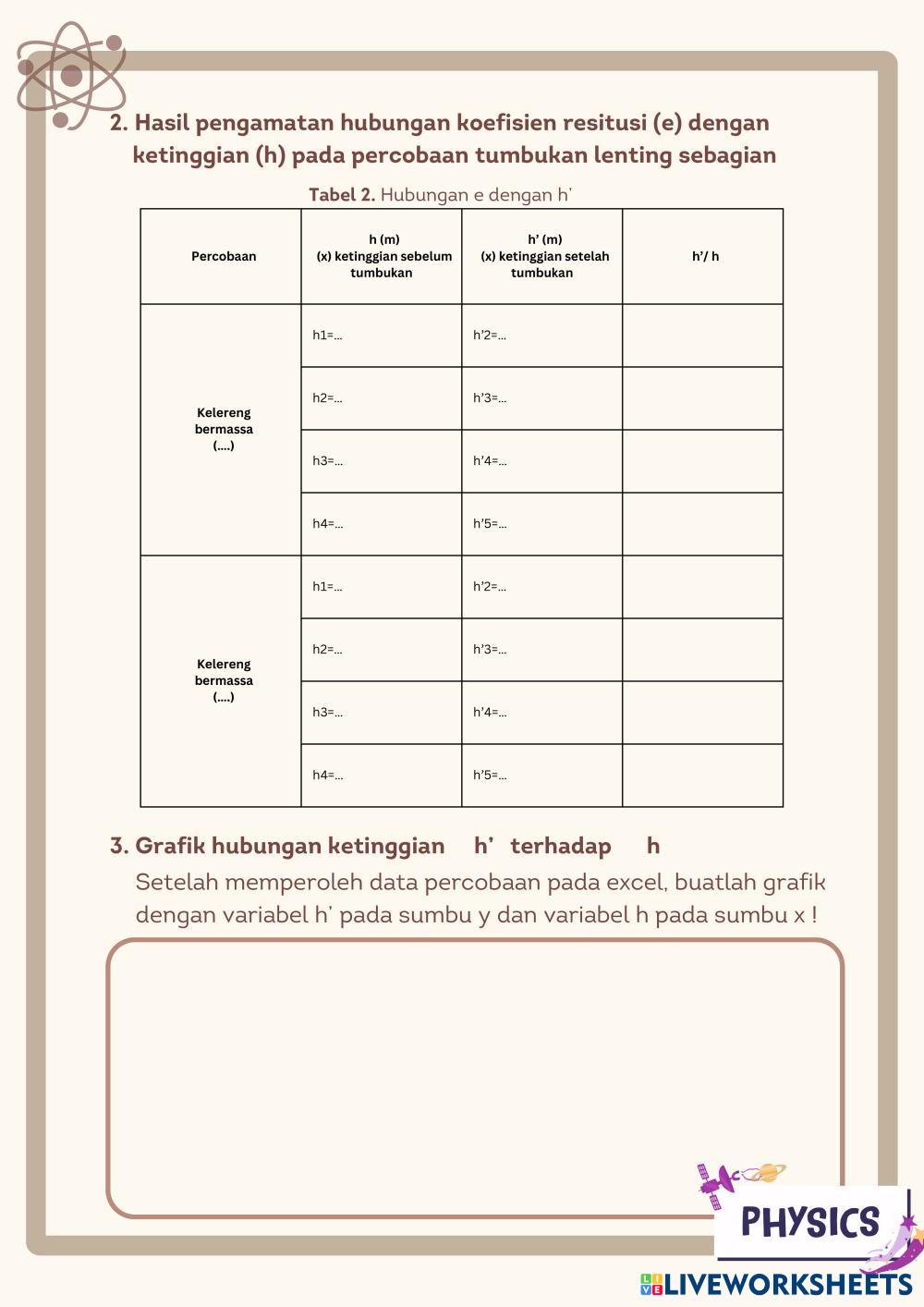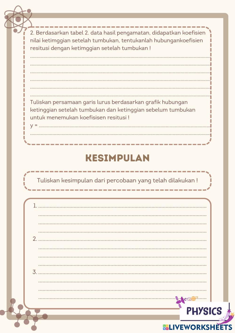 Created by aisyahhh PHYSICS Momentum impuls Edad 14+ level: 11 Indonesian Instrucciones del autor My Google Classroom Courses × 0 classes selected (0 students total) Quick Access Select all classes (0 classes) All Classes Loading courses... Cancelar Share Share to selected Course __COURSE_NAME__ __STUDENT_NAME__ (__STUDENT_EMAIL__) LKPD TUMBUKAN LENTING SEBAGIAN Descargar Worksheet Validation Comprobar mis respuestas Emails my answers to my teacher Nombre completo Group/level Asignatura Teacher's email or key code Close Submit Validating worksheet... (12) Your answers have been sent to your teacher. Good luck! OK We encountered an error submitting your answers. Please try again. OK Anuncio | Ir sin anuncios Created by aisyahhh PHYSICS Momentum impuls Edad 14+ level: 11 Indonesian Instrucciones del autor