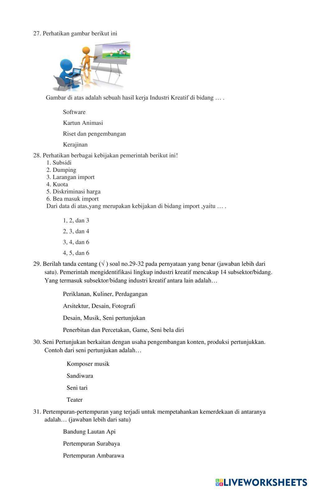 Created by LILIKSUS_28SMPK SAJ SAJ IPS Edad 14-18 level: 9 Indonesian Instrucciones del autor SAJ9 IPS My Google Classroom Courses × 0 classes selected (0 students total) Quick Access Select all classes (0 classes) All Classes Loading courses... Cancelar Share Share to selected Course __COURSE_NAME__ __STUDENT_NAME__ (__STUDENT_EMAIL__) SAJ Descargar Worksheet Validation Comprobar mis respuestas Emails my answers to my teacher Nombre completo Group/level Asignatura Teacher's email or key code Close Submit Validating worksheet... (12) Your answers have been sent to your teacher. Good luck! OK We encountered an error submitting your answers. Please try again. OK Anuncio | Ir sin anuncios Created by LILIKSUS_28SMPK SAJ SAJ IPS Edad 14-18 level: 9 Indonesian Instrucciones del autor SAJ9 IPS
