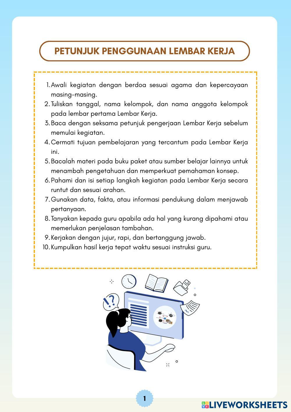 Bacalah instruksi yang diberikan pada lembar kerja dengan cermat, kerjakan dengan teliti, dan tanyakan kepada guru jika terdapat kesulitan