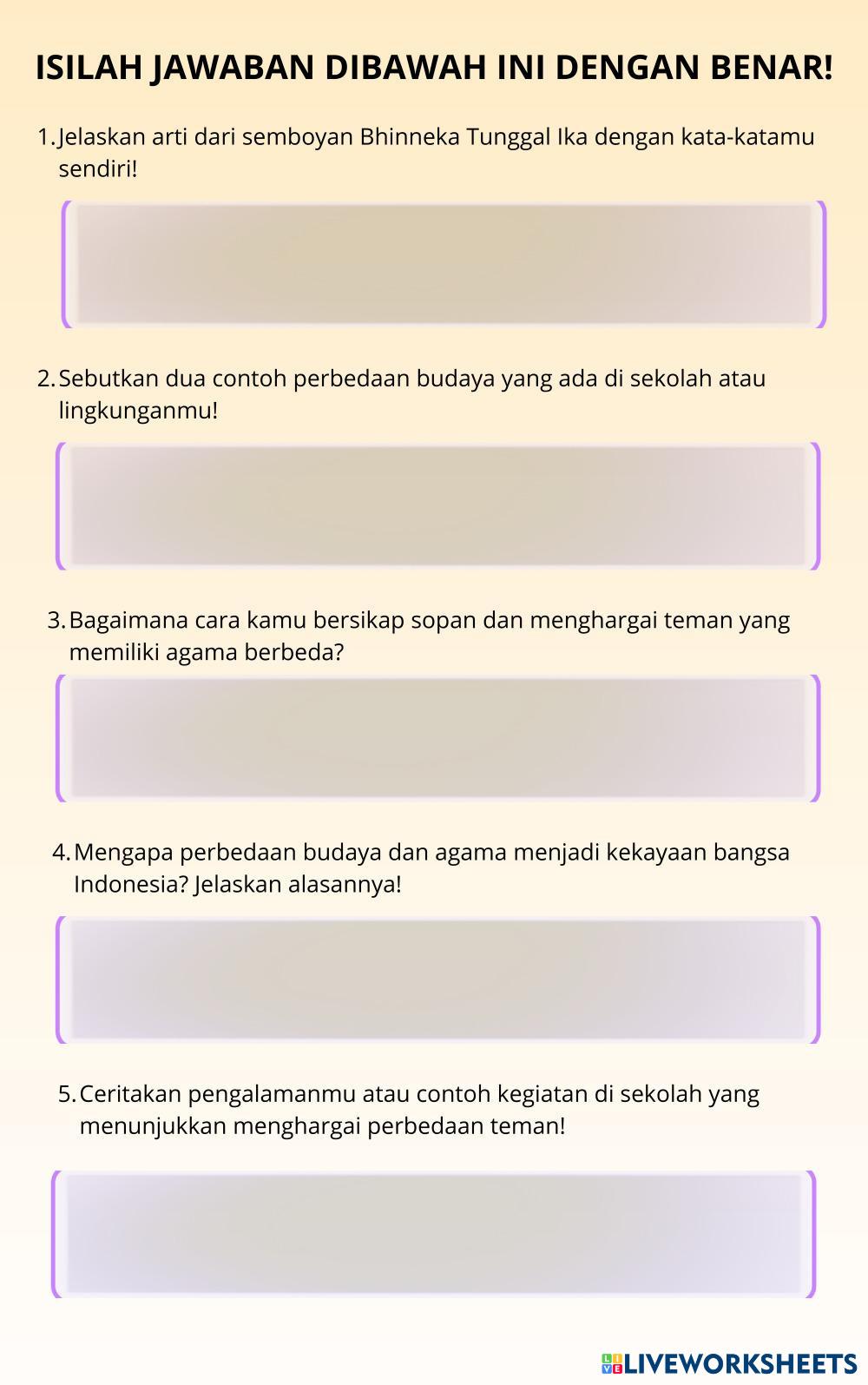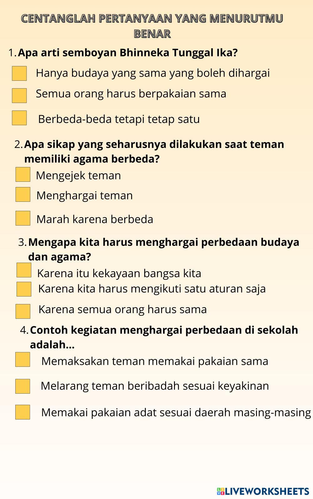 Created by rifaangga Ciencias Sociales Bachillerato 4º de ESO Civismo y Gobierno Indonesian Instrucciones del autor bbacarah sebelum menjawab My Google Classroom Courses × 0 classes selected (0 students total) Quick Access Select all classes (0 classes) All Classes Loading courses... Cancelar Share Share to selected Course __COURSE_NAME__ __STUDENT_NAME__ (__STUDENT_EMAIL__) soal sumatif Descargar Worksheet Validation Comprobar mis respuestas Emails my answers to my teacher Nombre completo Group/level Asignatura Teacher's email or key code Close Submit Validating worksheet... (12) Your answers have been sent to your teacher. Good luck! OK We encountered an error submitting your answers. Please try again. OK Anuncio | Ir sin anuncios Created by rifaangga Ciencias Sociales Bachillerato 4º de ESO Civismo y Gobierno Indonesian Instrucciones del autor bbacarah sebelum menjawab Explora las hojas de trabajo LKPD Pendidikan Pancasila Kelas 10 BAB 1 Sub 4 Social Studies 10th grade LKPD Pendidikan Pancasila Kelas 10 BAB 1 Sub 4 Civics and Government - Social Studies PETUNJUK: - Bacalah dengan seksama tugas LKPD berikut! - Diskusikan dengan kelompokmu! - Presentasikan hasil diskusimu di depan kelas! - Buatlah poster persuasif tentang "aktualisasi Pancasila dalam kehidupan berbangsa"! LKPD_Aktualisasi Pancasila Social Studies 10th grade LKPD_Aktualisasi Pancasila Civics and Government - Social Studies PETUNJUK: - Bacalah dengan seksama tugas LKPD berikut! - Diskusikan dengan kelompokmu! - Presentasikan hasil diskusimu di depan kelas! - Buatlah poster persuasif tentang "aktualisasi Pancasila dalam kehidupan berbangsa"! KAMIS - PAK - KELAS X Social Studies 10th grade KAMIS - PAK - KELAS X Civics and Government - Social Studies KERJAKAN SESUAI DENGAN JAWABAN YANG PALING BENAR ? KAMIS-PENDIDIKAN PANCASILA - KELAS X Social Studies 10th grade KAMIS-PENDIDIKAN PANCASILA - KELAS X Civics and Government - Social Studies KERJAKAN SESUAI DENGAN JAWABAN YANG PALING BENAR ?