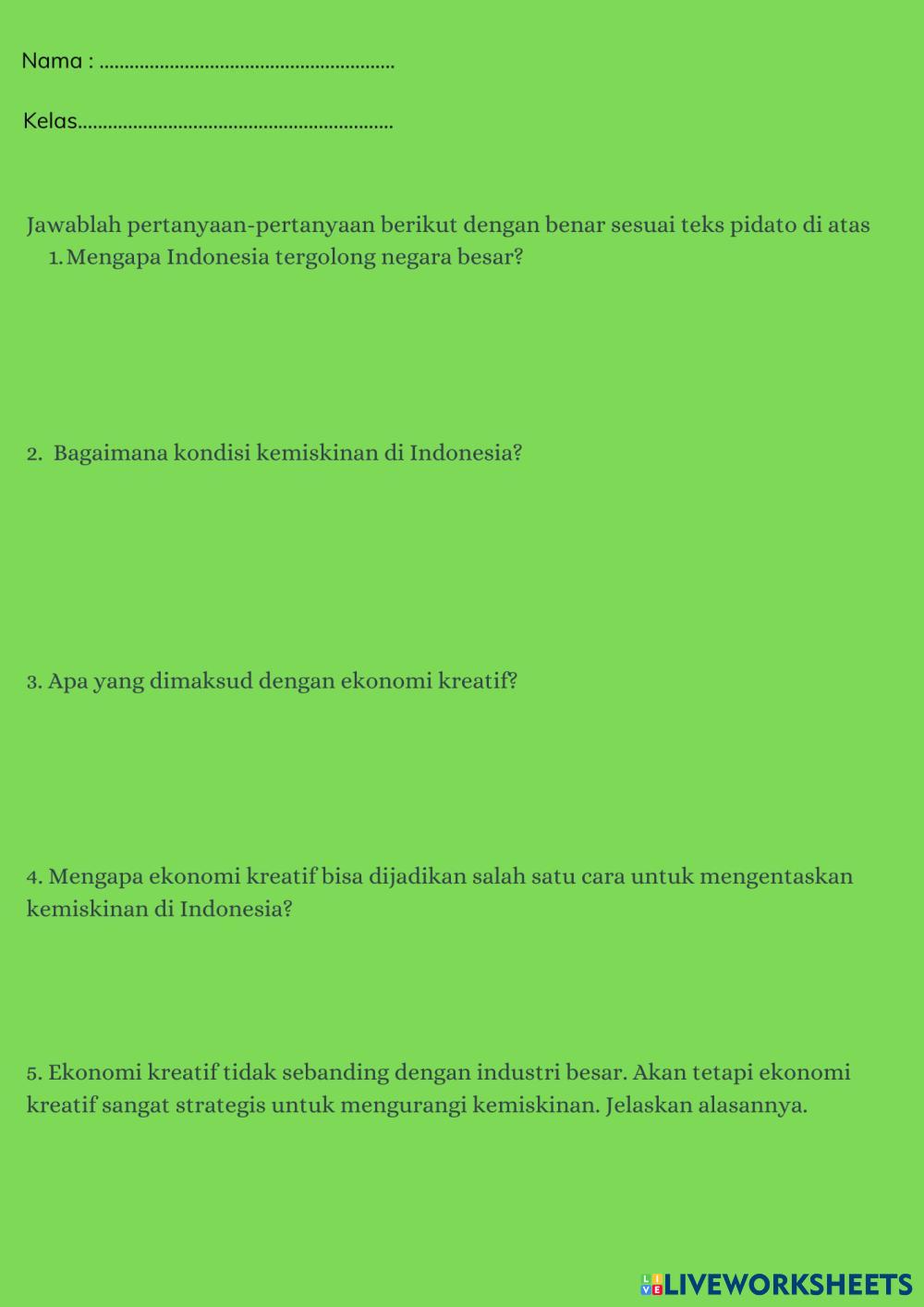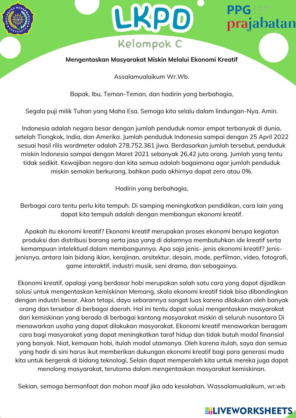 Created byCita Raras Nindya Pangesti TEKS PIDATO TEKS PIDATO Edad 11-18 level: 2 Indonesian Instrucciones del autor My Google Classroom Courses × 0 classes selected (0 students total) Quick Access Select all classes (0 classes) All Classes Loading courses... Cancelar Share Share to selected Course __COURSE_NAME__ __STUDENT_NAME__ (__STUDENT_EMAIL__) Lembar Kerja Peserta Didik Descargar Worksheet Validation Comprobar mis respuestas Emails my answers to my teacher Nombre completo Group/level Asignatura Teacher's email or key code Close Submit Validating worksheet... (12) Your answers have been sent to your teacher. Good luck! OK We encountered an error submitting your answers. Please try again. OK Anuncio | Ir sin anuncios Created byCita Raras Nindya Pangesti TEKS PIDATO TEKS PIDATO Edad 11-18 level: 2 Indonesian Instrucciones del autor