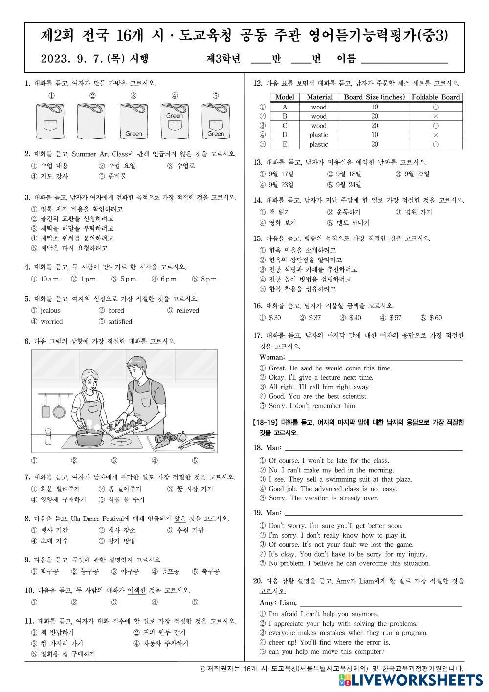 Created by김미라 English Language High School 9th grade Public Speaking Korean Author's Instructions Do your best! My Google Classroom Courses × 0 classes selected (0 students total) Quick Access Select all classes (0 classes) All Classes Loading courses... Cancelar Share Share to selected Course __COURSE_NAME__ __STUDENT_NAME__ (__STUDENT_EMAIL__) 2023-2 중3 영듣평 문제지 Download Worksheet Validation Comprobar mis respuestas Emails my answers to my teacher Nombre completo Group/level Asignatura Teacher's email or key code Close Submit Validating worksheet... (12) Your answers have been sent to your teacher. Good luck! OK We encountered an error submitting your answers. Please try again. OK Anuncio | Ir sin anuncios Created by김미라 English Language High School 9th grade Public Speaking Korean Author's Instructions Do your best! Explore Worksheets MORFOLOGÍA English Language 9th grade MORFOLOGÍA Public Speaking - English Language RESOLVER CORRECTAMENTE LAS SIGUIENTES PREGUNTAS. DIALOGUE: SHOWING INTEREST English Language 9th grade DIALOGUE: SHOWING INTEREST Public Speaking - English Language LISEN AND COMPLETE THE DIALOGUE Latihan Soal TKA English Language 9th grade Latihan Soal TKA Public Speaking - English Language Kerjakan soal berikut! Ficha 1 English Language 9th grade Ficha 1 Public Speaking - English Language Identifica los siguientes intervalos después de escucharlos y escribe la nota que completa el intervalo
