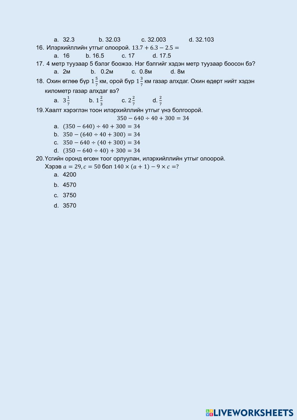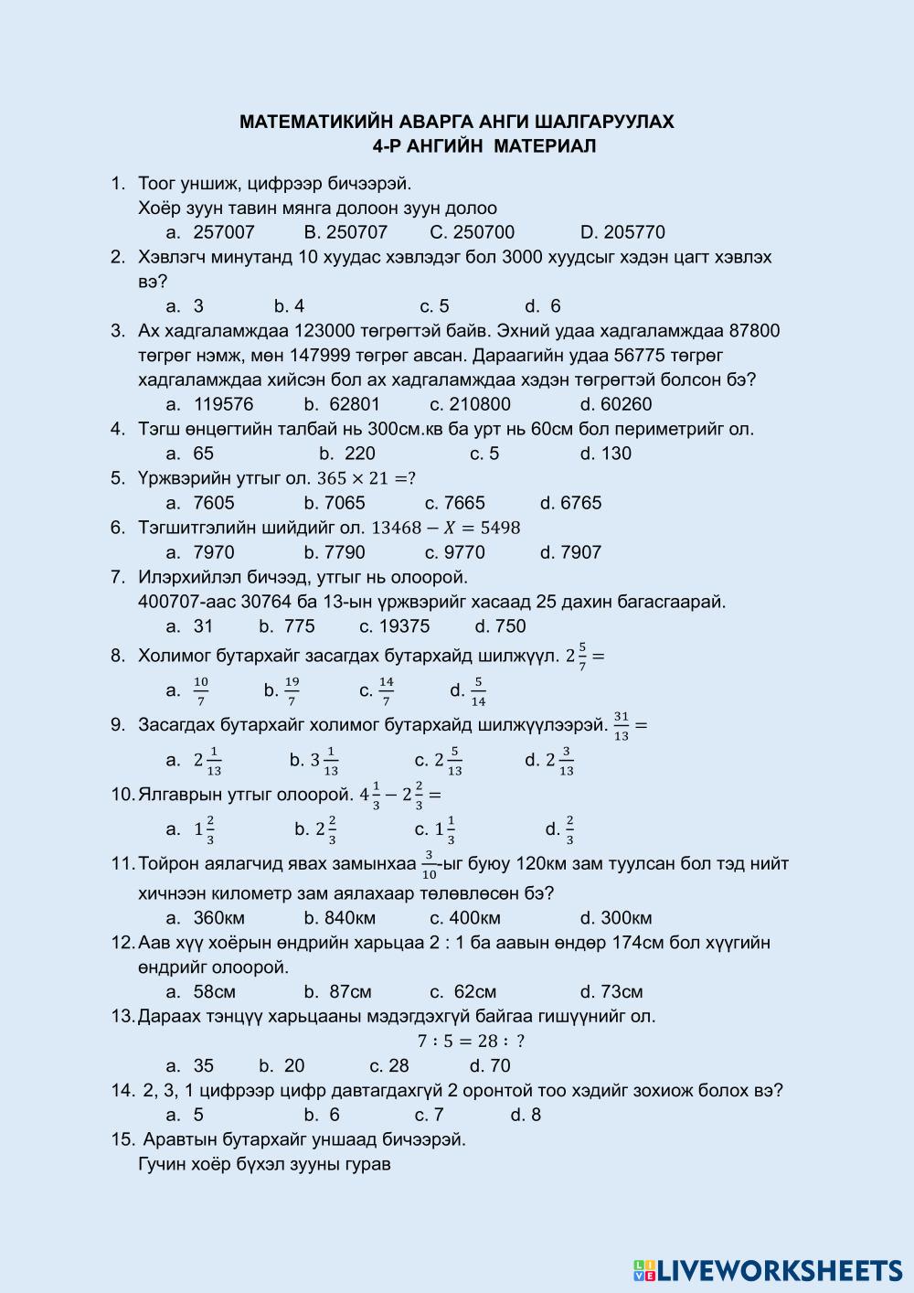 Created by otgoojam Matemáticas Educación Primaria 4º de Primaria Adición y Sustracción Mongolian Instrucciones del autor Хольмог тест My Google Classroom Courses × 0 classes selected (0 students total) Quick Access Select all classes (0 classes) All Classes Loading courses... Cancelar Share Share to selected Course __COURSE_NAME__ __STUDENT_NAME__ (__STUDENT_EMAIL__) Математик уралдаан 4 Descargar Worksheet Validation Comprobar mis respuestas Emails my answers to my teacher Nombre completo Group/level Asignatura Teacher's email or key code Close Submit Validating worksheet... (12) Your answers have been sent to your teacher. Good luck! OK We encountered an error submitting your answers. Please try again. OK Anuncio | Ir sin anuncios Created by otgoojam Matemáticas Educación Primaria 4º de Primaria Adición y Sustracción Mongolian Instrucciones del autor Хольмог тест Explora las hojas de trabajo Giải ô chữ Math 4th grade Giải ô chữ Addition and Subtraction - Math Giải ô chữ MULTIPLICACIÓNES 6 ABRIL Math 4th grade MULTIPLICACIÓNES 6 ABRIL Addition and Subtraction - Math RESUELVE MULTIPLICACIÓNES 3 ABRIL Math 4th grade MULTIPLICACIÓNES 3 ABRIL Addition and Subtraction - Math RESUELVE RESTAS 2 ABRIL Math 4th grade RESTAS 2 ABRIL Addition and Subtraction - Math RESUELVE