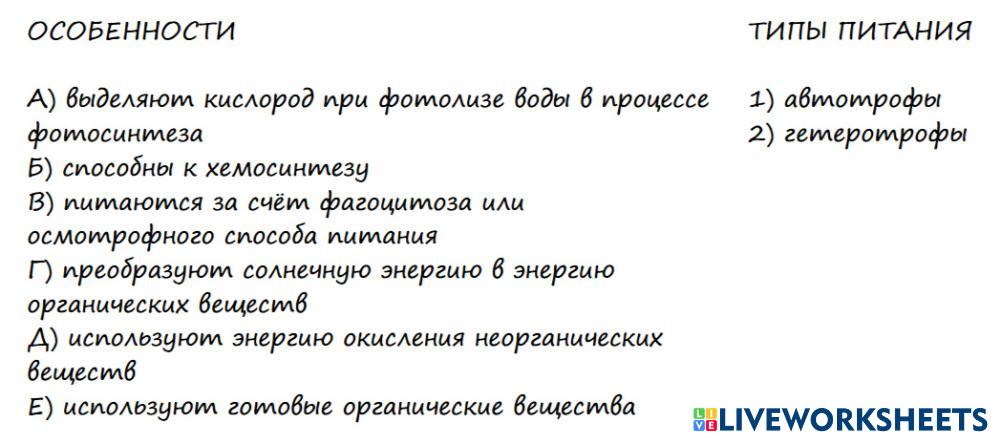 Соотнесите тип питания и его особенности