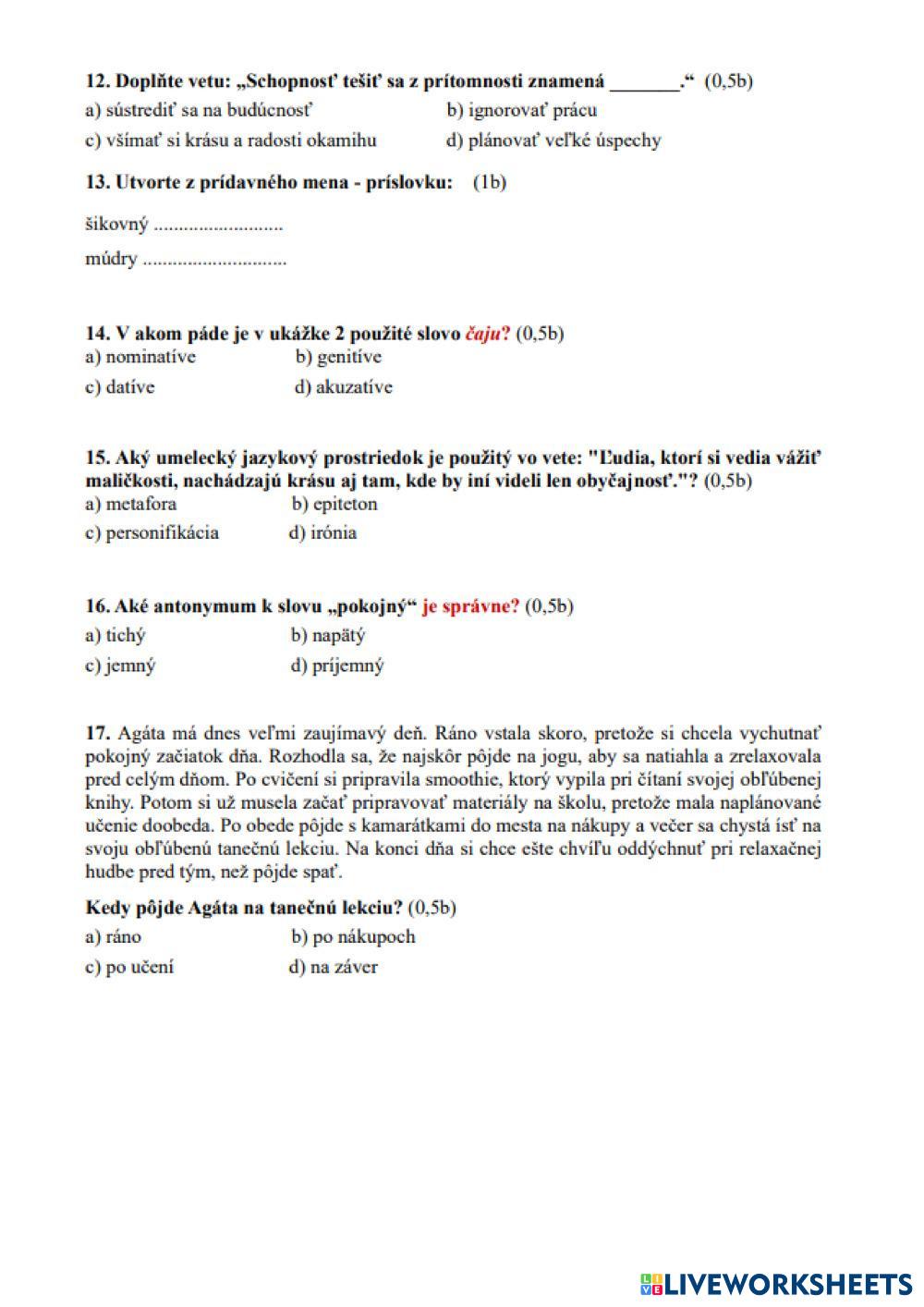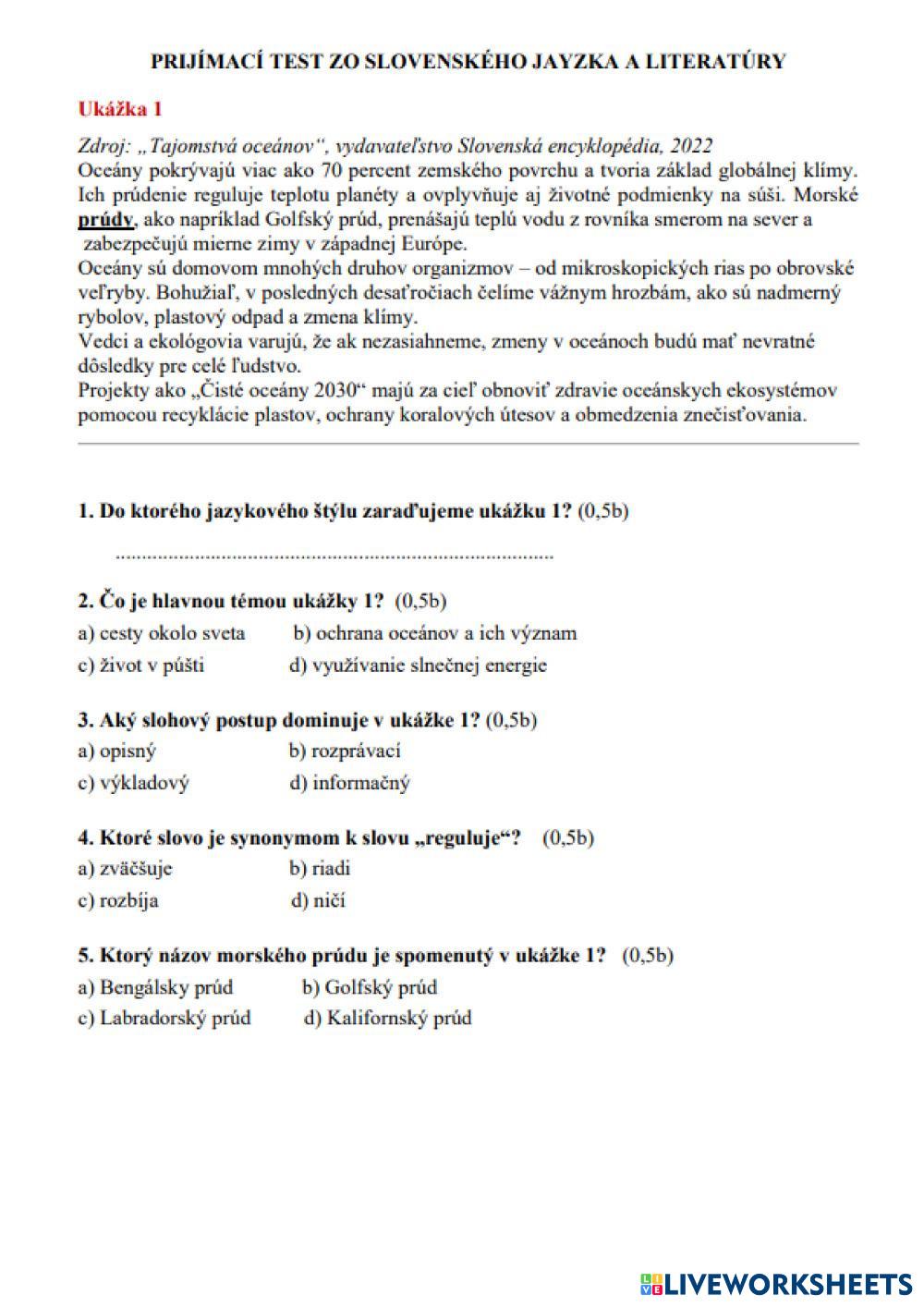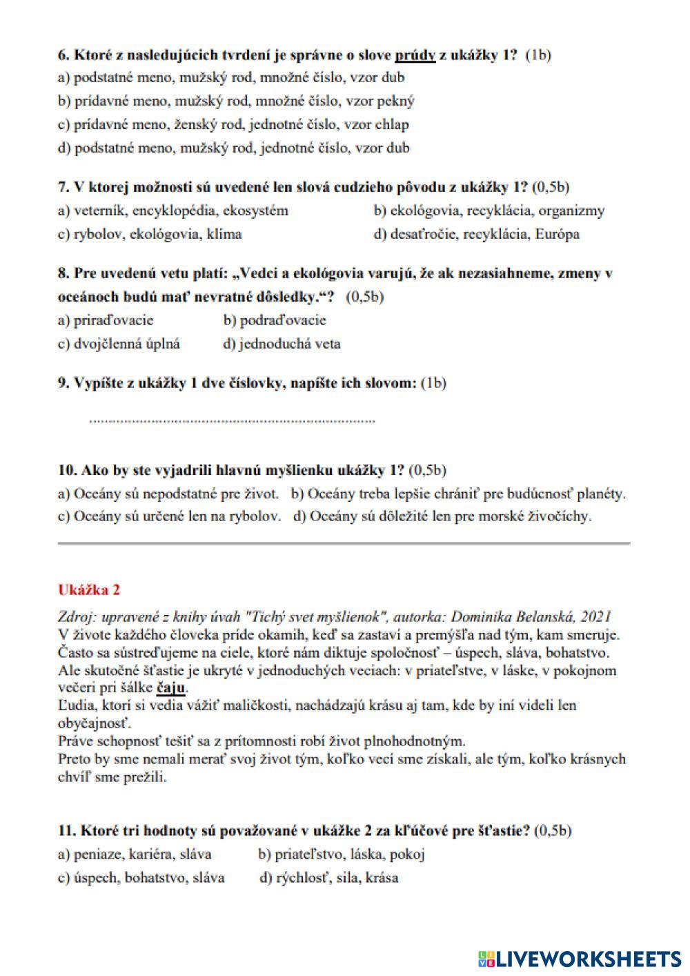 Created by YozefTetak ESL Slovak C2 (Maestría) Gramática Slovak Instrucciones del autor Odpovedz My Google Classroom Courses × 0 classes selected (0 students total) Quick Access Select all classes (0 classes) All Classes Loading courses... Cancelar Share Share to selected Course __COURSE_NAME__ __STUDENT_NAME__ (__STUDENT_EMAIL__) Test_SPŠ Descargar Worksheet Validation Comprobar mis respuestas Emails my answers to my teacher Nombre completo Group/level Asignatura Teacher's email or key code Close Submit Validating worksheet... (12) Your answers have been sent to your teacher. Good luck! OK We encountered an error submitting your answers. Please try again. OK Anuncio | Ir sin anuncios Created by YozefTetak ESL Slovak C2 (Maestría) Gramática Slovak Instrucciones del autor Odpovedz Explora las hojas de trabajo Prijímačkový test_gym_TS_II_8-ročné ESL C2 Prijímačkový test_gym_TS_II_8-ročné Grammar - ESL odpovedz Cvičný test_na_8_ročné_GYM_TS_I ESL C2 Cvičný test_na_8_ročné_GYM_TS_I Grammar - ESL vyber správnu odpoveď Literárne pojmy_5.roč. ESL C2 Literárne pojmy_5.roč. Grammar - ESL Označ správne odpovede - pozor, v niektorých otázkach ich je viac Pravopis_pekný/cudzí ESL C2 Pravopis_pekný/cudzí Grammar - ESL vyber správnu možnosť