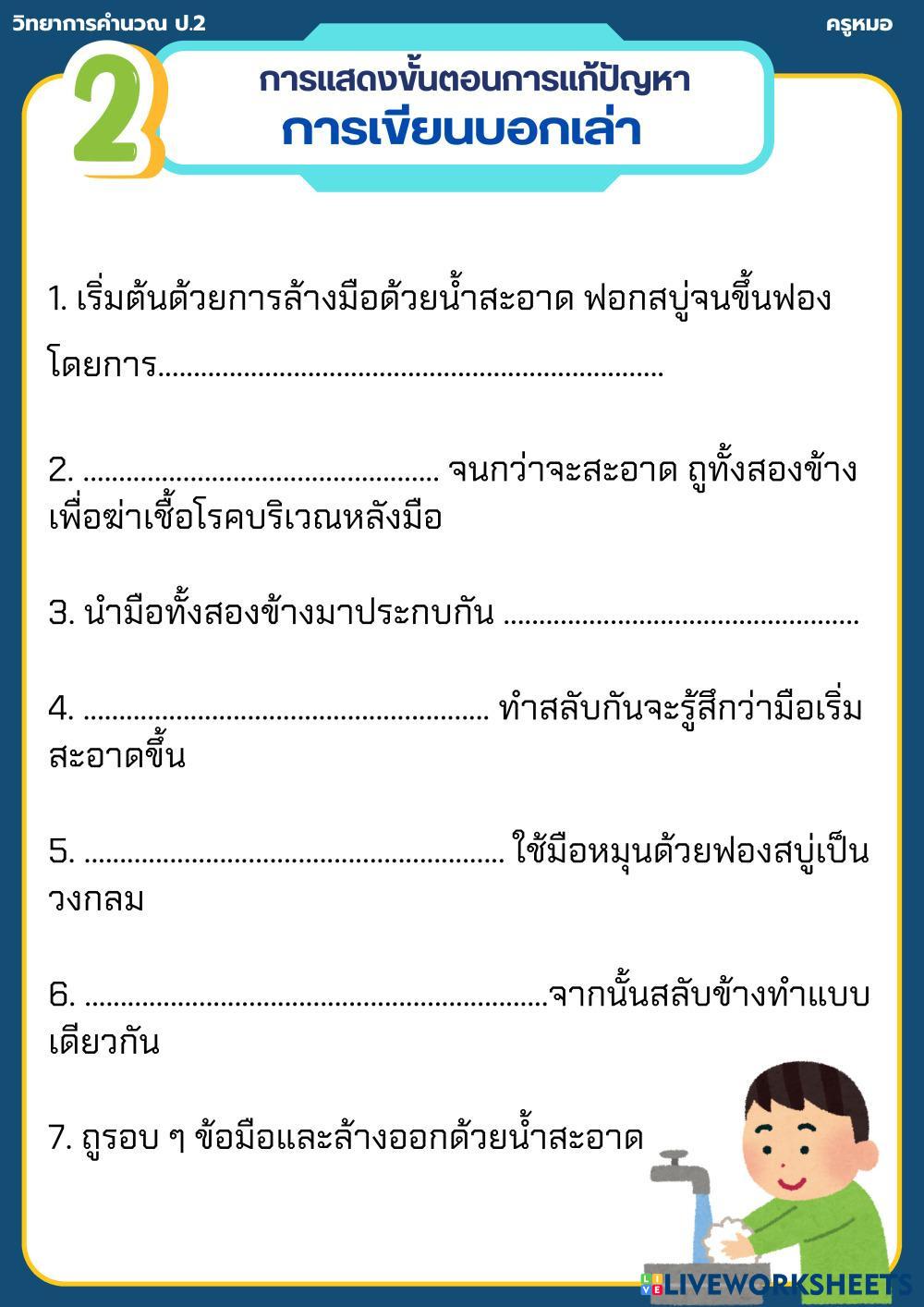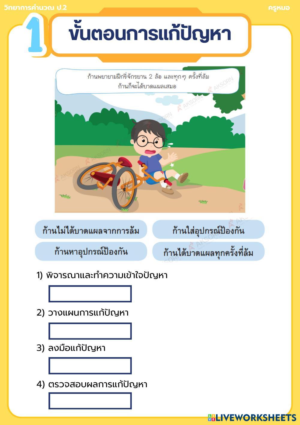 Created byDrTida computer ใบงาน รวบยอด การแสดงขั้นตอนการแก้ปัญหา ป.2 Edad 8+ level: 2 Thai Instrucciones del autor My Google Classroom Courses × 0 classes selected (0 students total) Quick Access Select all classes (0 classes) All Classes Loading courses... Cancelar Share Share to selected Course __COURSE_NAME__ __STUDENT_NAME__ (__STUDENT_EMAIL__) ใบงาน รวบยอด การแสดงขั้นตอนการแก้ปัญหา ป.2 Descargar Worksheet Validation Comprobar mis respuestas Emails my answers to my teacher Nombre completo Group/level Asignatura Teacher's email or key code Close Submit Validating worksheet... (12) Your answers have been sent to your teacher. Good luck! OK We encountered an error submitting your answers. Please try again. OK Anuncio | Ir sin anuncios Created byDrTida computer ใบงาน รวบยอด การแสดงขั้นตอนการแก้ปัญหา ป.2 Edad 8+ level: 2 Thai Instrucciones del autor
