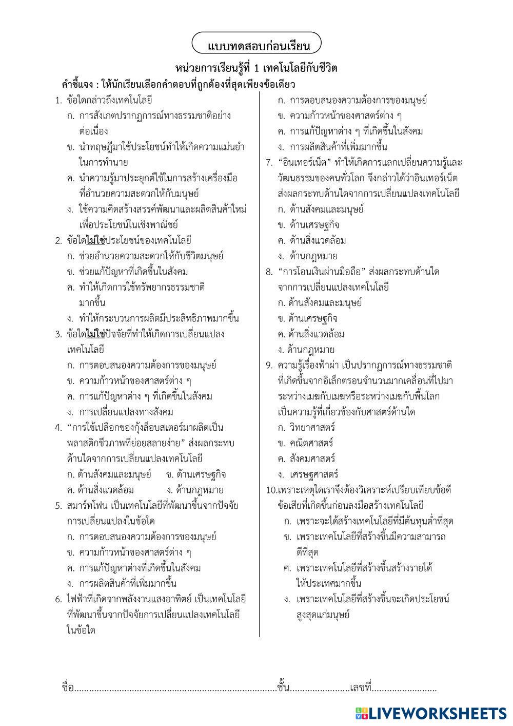 แบบทดสอบก่อนเรียน วิชาออกแบบและเทคโนโลยี หน่วยการเรียนรู้ที่ 1 เรื่อง เทคโนโลยีกับชีวิต