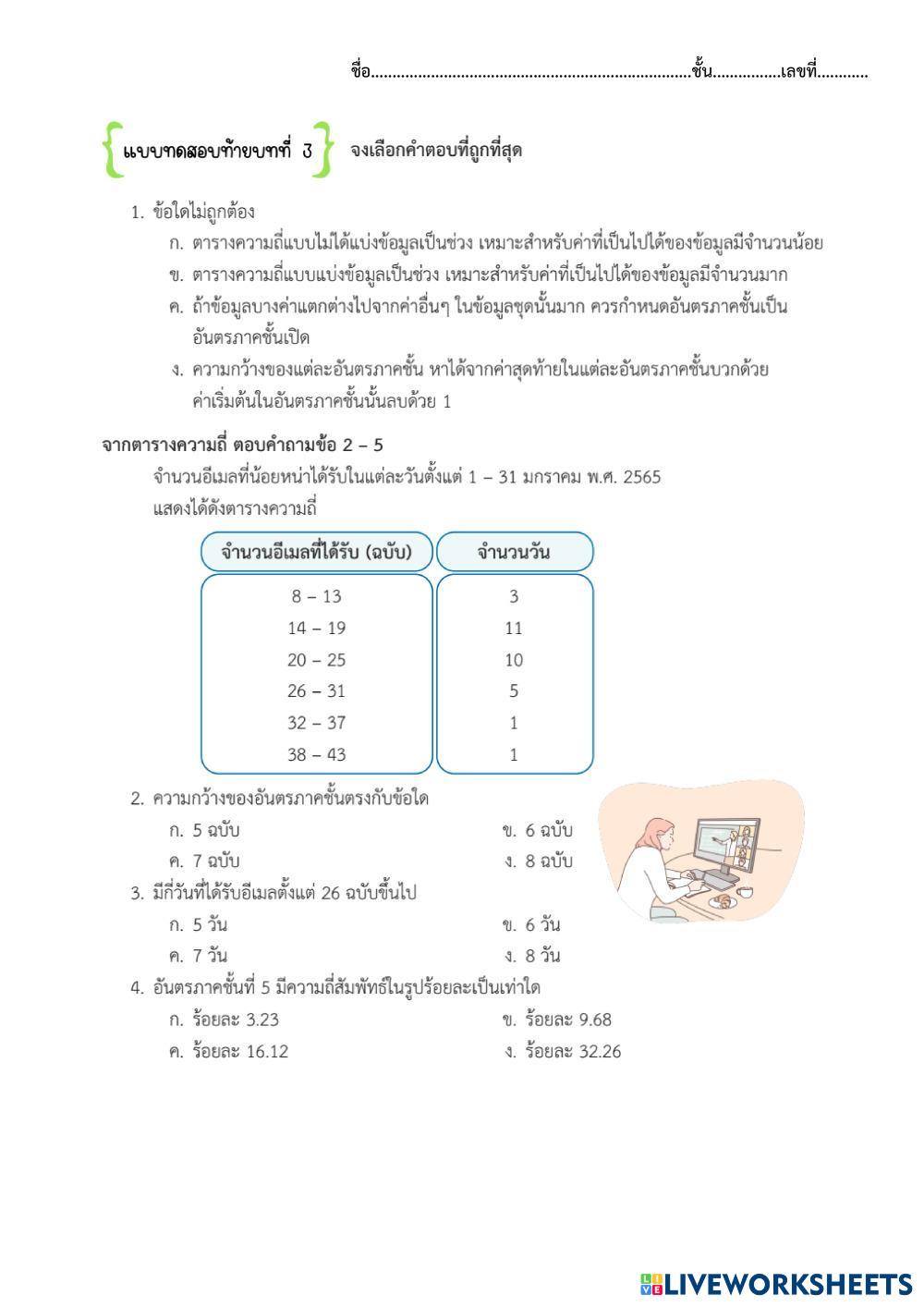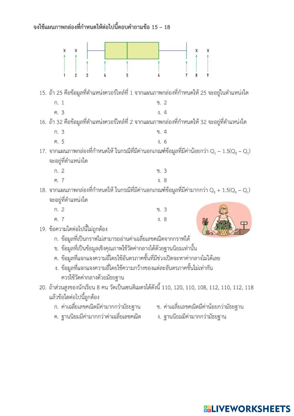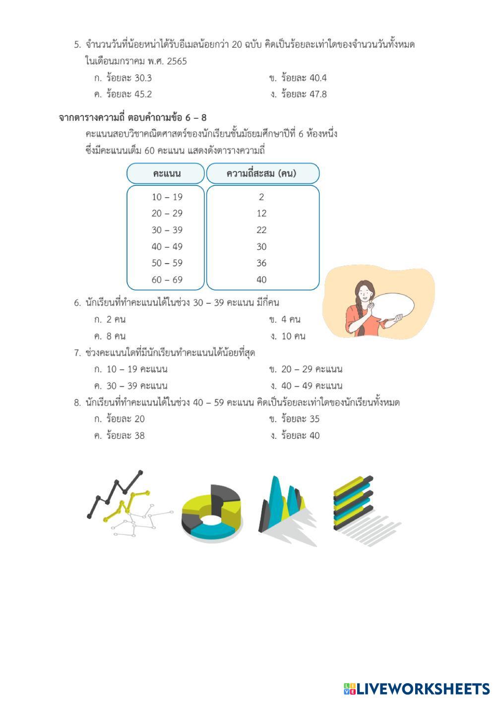 Created bybelly Statistics การวิเคราะห์และนำเสนอข้อมูลเชิงปริมาณ Edad 17+ level: ม.6 Thai Instrucciones del autor My Google Classroom Courses × 0 classes selected (0 students total) Quick Access Select all classes (0 classes) All Classes Loading courses... Cancelar Share Share to selected Course __COURSE_NAME__ __STUDENT_NAME__ (__STUDENT_EMAIL__) เก็บคะแนนบทที่ 3 ม.6 เทอม 2 Descargar Worksheet Validation Comprobar mis respuestas Emails my answers to my teacher Nombre completo Group/level Asignatura Teacher's email or key code Close Submit Validating worksheet... (12) Your answers have been sent to your teacher. Good luck! OK We encountered an error submitting your answers. Please try again. OK Anuncio | Ir sin anuncios Created bybelly Statistics การวิเคราะห์และนำเสนอข้อมูลเชิงปริมาณ Edad 17+ level: ม.6 Thai Instrucciones del autor