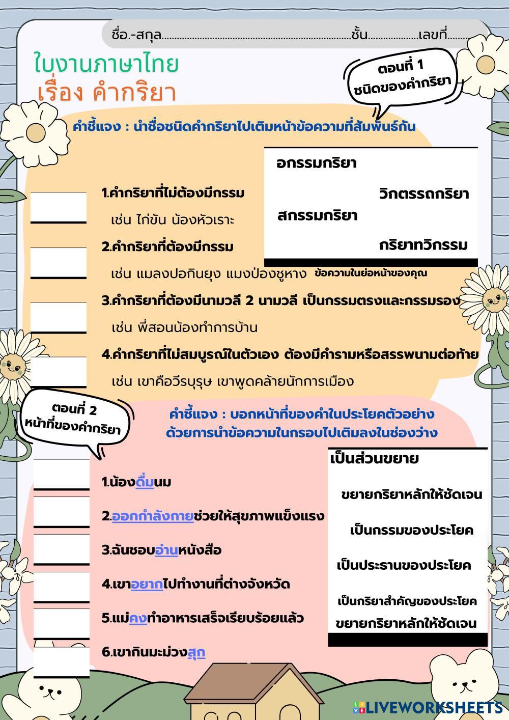 Created bySirikorn Kaewto Thai Language คำกริยา Edad 12-18 level: M. Thai Author's Instructions My Google Classroom Courses × 0 classes selected (0 students total) Quick Access Select all classes (0 classes) All Classes Loading courses... Cancelar Share Share to selected Course __COURSE_NAME__ __STUDENT_NAME__ (__STUDENT_EMAIL__) ใบงานคำกริยา Download Worksheet Validation Comprobar mis respuestas Emails my answers to my teacher Nombre completo Group/level Asignatura Teacher's email or key code Close Submit Validating worksheet... (12) Your answers have been sent to your teacher. Good luck! OK We encountered an error submitting your answers. Please try again. OK Anuncio | Ir sin anuncios Created bySirikorn Kaewto Thai Language คำกริยา Edad 12-18 level: M. Thai Author's Instructions