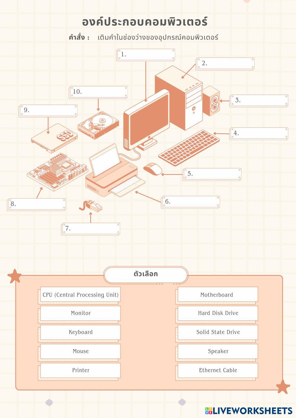 Created by TEhmai อุปกรณ์คอมพิวเตอร์ อุปกรณ์คอมพิวเตอร์ Edad 10-18 level: ปานกลาง Thai Instrucciones del autor My Google Classroom Courses × 0 classes selected (0 students total) Quick Access Select all classes (0 classes) All Classes Loading courses... Cancelar Share Share to selected Course __COURSE_NAME__ __STUDENT_NAME__ (__STUDENT_EMAIL__) องค์ประกอบของคอมพิวเตอร์ Descargar Worksheet Validation Comprobar mis respuestas Emails my answers to my teacher Nombre completo Group/level Asignatura Teacher's email or key code Close Submit Validating worksheet... (12) Your answers have been sent to your teacher. Good luck! OK We encountered an error submitting your answers. Please try again. OK Anuncio | Ir sin anuncios Created by TEhmai อุปกรณ์คอมพิวเตอร์ อุปกรณ์คอมพิวเตอร์ Edad 10-18 level: ปานกลาง Thai Instrucciones del autor