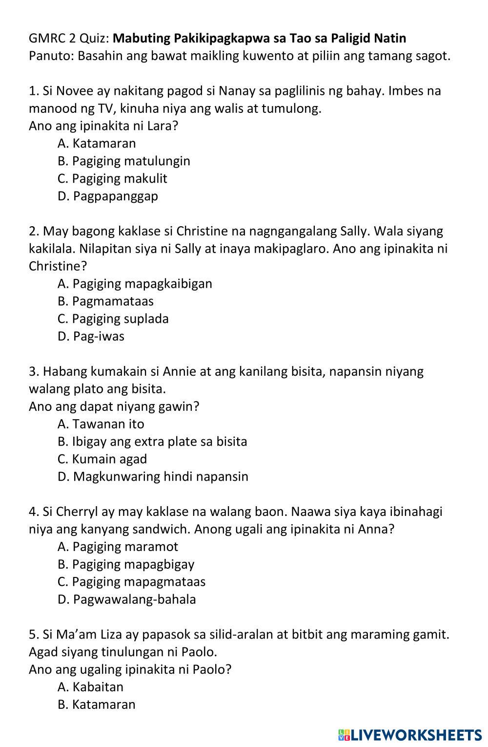 Panuto: Basahin ang bawat maikling kuwento at piliin ang tamang sagot.