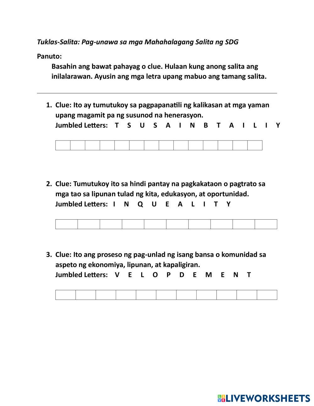 Basahin ang bawat pahayag o clue. Hulaan kung anong salita ang inilalarawan. Ayusin ang mga letra upang mabuo ang tamang salita.