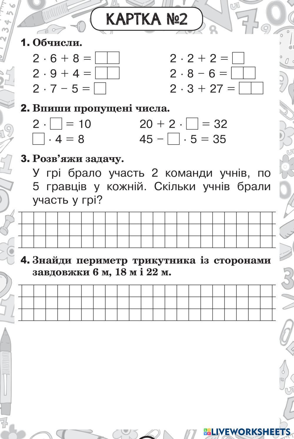 Created byАнна Годына Математика 2 клас Табличне множення та ділення Edad 7-12 level: 2 клас Ukrainian Instrucciones del autor My Google Classroom Courses × 0 classes selected (0 students total) Quick Access Select all classes (0 classes) All Classes Loading courses... Cancelar Share Share to selected Course __COURSE_NAME__ __STUDENT_NAME__ (__STUDENT_EMAIL__) Множення числа 2 Descargar Worksheet Validation Comprobar mis respuestas Emails my answers to my teacher Nombre completo Group/level Asignatura Teacher's email or key code Close Submit Validating worksheet... (12) Your answers have been sent to your teacher. Good luck! OK We encountered an error submitting your answers. Please try again. OK Anuncio | Ir sin anuncios Created byАнна Годына Математика 2 клас Табличне множення та ділення Edad 7-12 level: 2 клас Ukrainian Instrucciones del autor