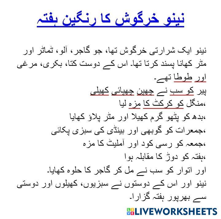 دی گئی تفہیم کو پڑھیں اور اس میں موجود دنوں ، جانوروں اور سبزیوں کے ناموں کو الگ الگ کالم میں لے کے جائیں۔