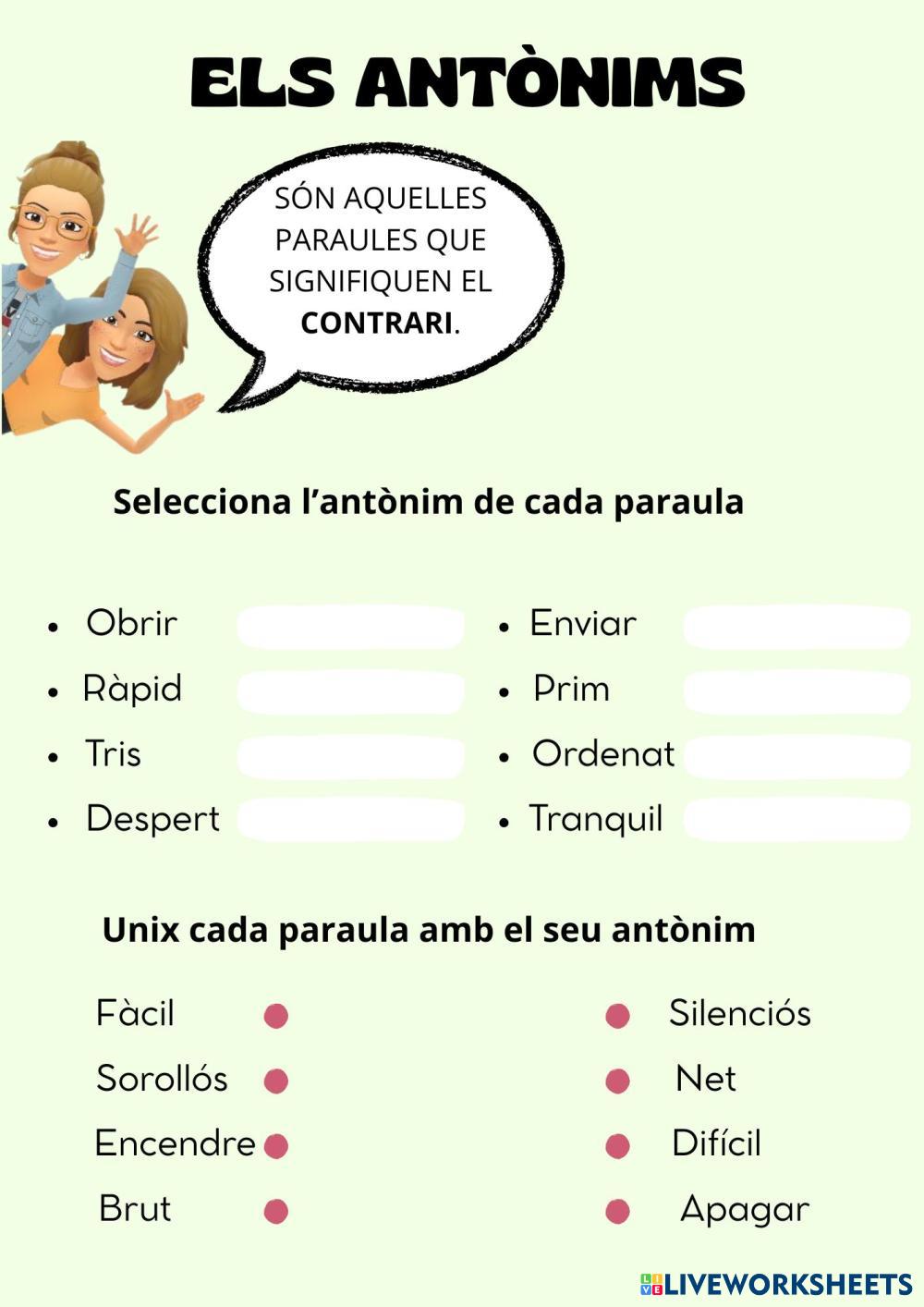 Created byIrene Valencià Antònims Edad 7-11 level: 2n Valencian Instrucciones del autor My Google Classroom Courses × 0 classes selected (0 students total) Quick Access Select all classes (0 classes) All Classes Loading courses... Cancelar Share Share to selected Course __COURSE_NAME__ __STUDENT_NAME__ (__STUDENT_EMAIL__) ANTONIMS Descargar Worksheet Validation Comprobar mis respuestas Emails my answers to my teacher Nombre completo Group/level Asignatura Teacher's email or key code Close Submit Validating worksheet... (12) Your answers have been sent to your teacher. Good luck! OK We encountered an error submitting your answers. Please try again. OK Anuncio | Ir sin anuncios Created byIrene Valencià Antònims Edad 7-11 level: 2n Valencian Instrucciones del autor