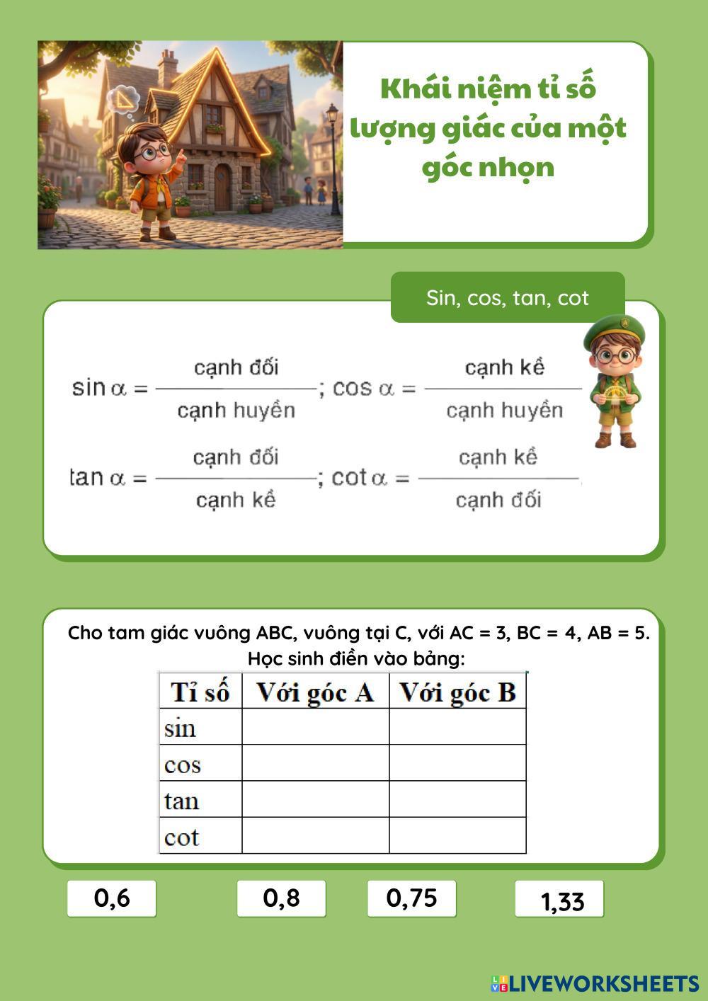 Created by mantrieu Matemáticas Bachillerato 3º de ESO Álgebra Vietnamese Instrucciones del autor Căn bậc ba và căn thức bậc ba My Google Classroom Courses × 0 classes selected (0 students total) Quick Access Select all classes (0 classes) All Classes Loading courses... Cancelar Share Share to selected Course __COURSE_NAME__ __STUDENT_NAME__ (__STUDENT_EMAIL__) Bí ẩn xứ sở khối lập phương Descargar Worksheet Validation Comprobar mis respuestas Emails my answers to my teacher Nombre completo Group/level Asignatura Teacher's email or key code Close Submit Validating worksheet... (12) Your answers have been sent to your teacher. Good luck! OK We encountered an error submitting your answers. Please try again. OK Anuncio | Ir sin anuncios Created by mantrieu Matemáticas Bachillerato 3º de ESO Álgebra Vietnamese Instrucciones del autor Căn bậc ba và căn thức bậc ba Explora las hojas de trabajo Bí ấn xứ sở khối lập phương Math 9th grade Bí ấn xứ sở khối lập phương Algebra - Math Căn bậc ba và căn thức bậc ba Biệt đội đo đạc Math 9th grade Biệt đội đo đạc Algebra - Math Tỉ số lượng giác của góc nhọn LKPD MATEMATIKA Math 9th grade LKPD MATEMATIKA Algebra - Math Kerjakan LKPD berikut حساب قيمة الضريبة المضافة Math 9th grade حساب قيمة الضريبة المضافة Algebra - Math اوجد الثمن الاصلي للسعة قبل اضافة ضريبة القيمة المضافة