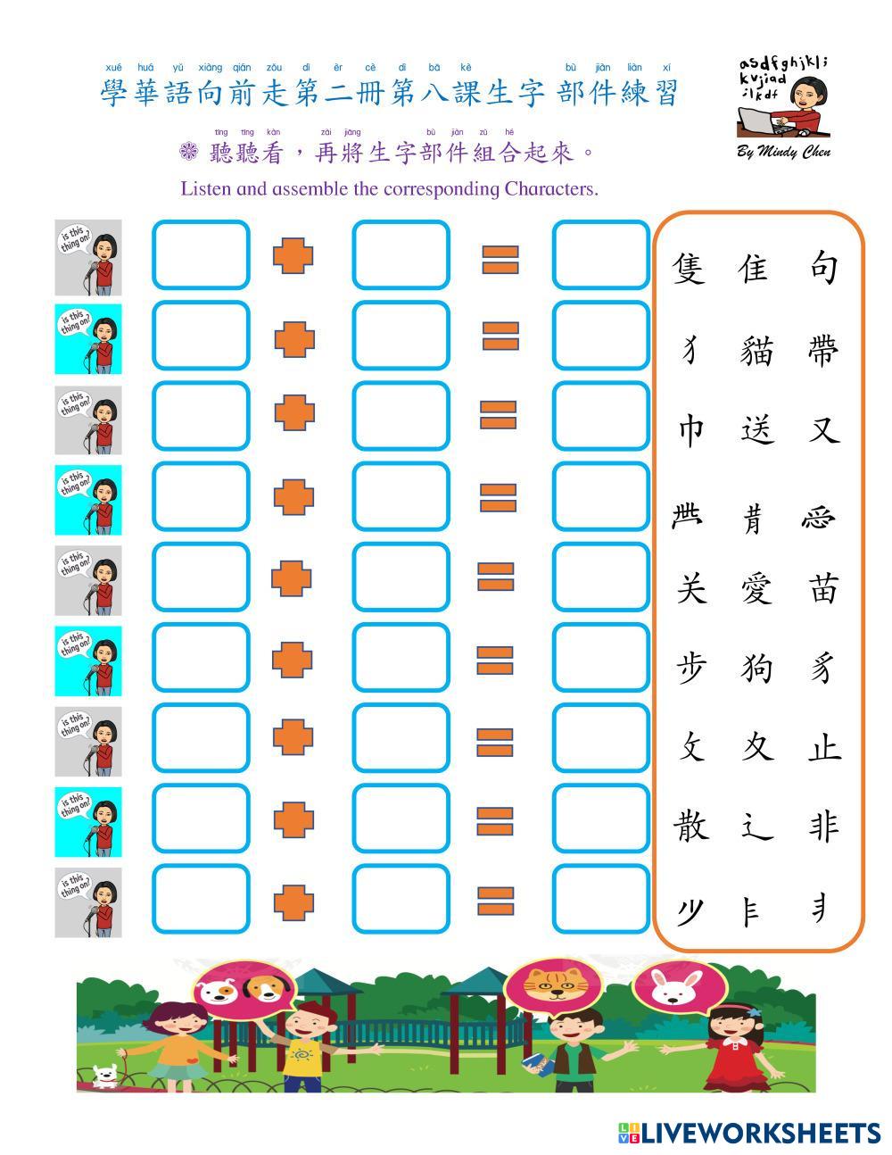 Created byMei Huei Kao Chinese Language Listening Edad 6+ level: 2 Chinese Author's Instructions My Google Classroom Courses × 0 classes selected (0 students total) Quick Access Select all classes (0 classes) All Classes Loading courses... Cancelar Share Share to selected Course __COURSE_NAME__ __STUDENT_NAME__ (__STUDENT_EMAIL__) 學華語向前走第二冊第八課A 生字部件 Download Worksheet Validation Comprobar mis respuestas Emails my answers to my teacher Nombre completo Group/level Asignatura Teacher's email or key code Close Submit Validating worksheet... (12) Your answers have been sent to your teacher. Good luck! OK We encountered an error submitting your answers. Please try again. OK Anuncio | Ir sin anuncios Created byMei Huei Kao Chinese Language Listening Edad 6+ level: 2 Chinese Author's Instructions