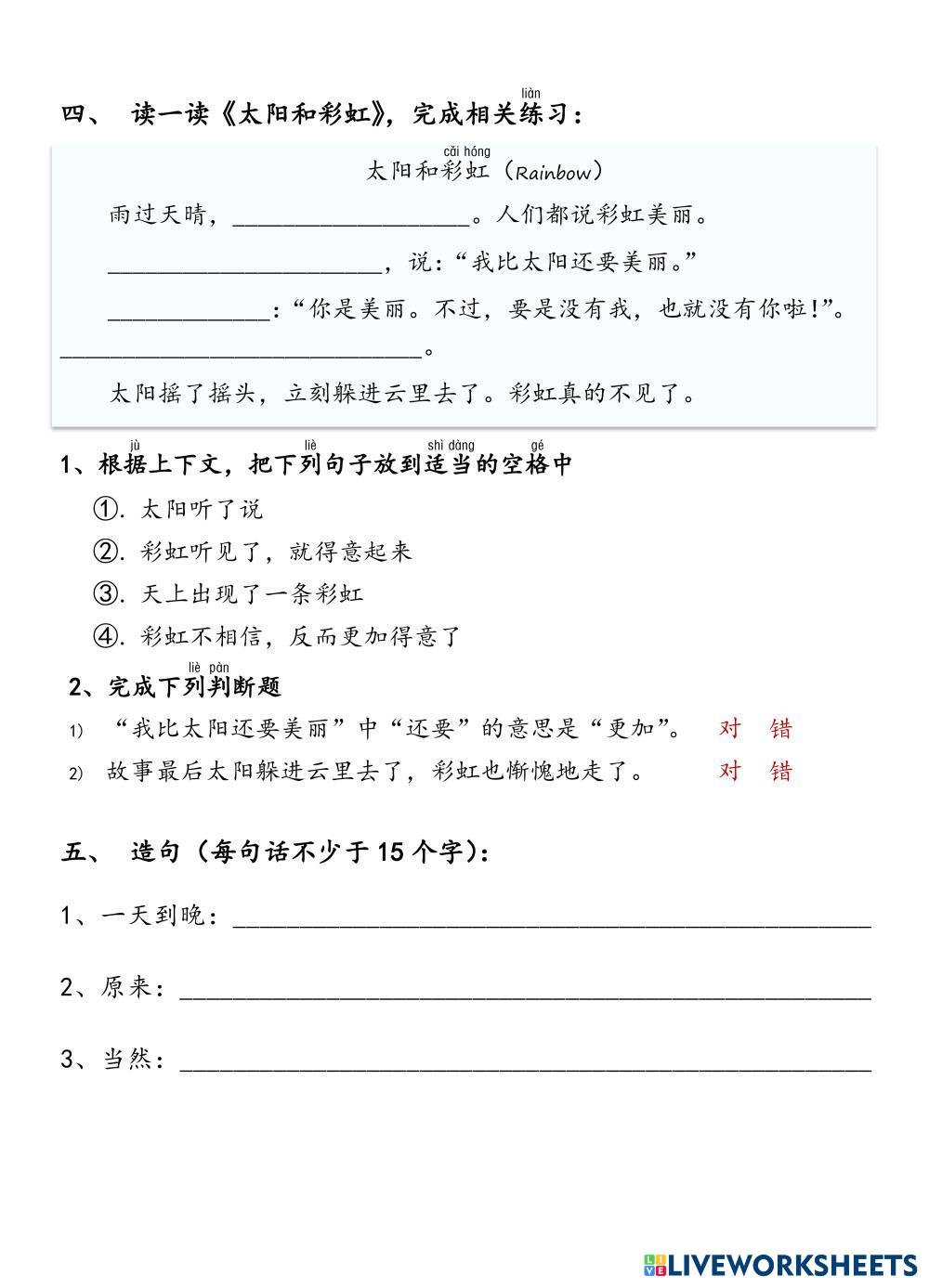 Created byMin Miao ESL Chinese, Simplified A2 (Básico) Lectura Chinese Instrucciones del autor G3 My Google Classroom Courses × 0 classes selected (0 students total) Quick Access Select all classes (0 classes) All Classes Loading courses... Cancelar Share Share to selected Course __COURSE_NAME__ __STUDENT_NAME__ (__STUDENT_EMAIL__) G3-3-2《爸爸的老师》(上)2 Descargar Worksheet Validation Comprobar mis respuestas Emails my answers to my teacher Nombre completo Group/level Asignatura Teacher's email or key code Close Submit Validating worksheet... (12) Your answers have been sent to your teacher. Good luck! OK We encountered an error submitting your answers. Please try again. OK Anuncio | Ir sin anuncios Created byMin Miao ESL Chinese, Simplified A2 (Básico) Lectura Chinese Instrucciones del autor G3 Explora las hojas de trabajo HSK 2 Reading Practice _ Part 4 ESL A2 HSK 2 Reading Practice _ Part 4 Reading - ESL Part 4. Choose the correct sentence to make a short conversation. (10 Questions) HSK 2 Reading Practice _ Part 1 &2 ESL A2 HSK 2 Reading Practice _ Part 1 &2 Reading - ESL Part 1. Choose the correct picture. (5 Questions) Part 2. Choose the correct word. (5 Questions) 阅读与理解 ESL A2 阅读与理解 Reading - ESL 读一读,然后回答问题。 G3-3-1《光阴一去不复返》上(2) ESL A2 G3-3-1《光阴一去不复返》上(2) Reading - ESL G3
