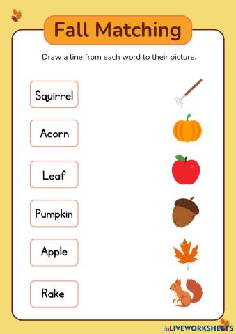 • English as a Second Language (ESL) Fall Worksheet for Kids - Matching Pictures With Words English Level K5