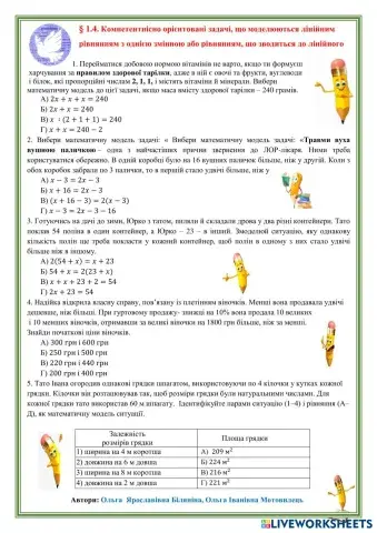 • математика Компетентнісно орієнтовані задачі, що моделюються лінійним рівнянням з однією змінною або рівнянням, що зводиться до лінійного Ukrainian Level 7