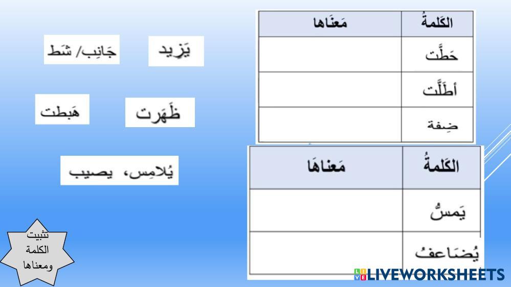 Created byحمد مرعي ESL Arabic C2 (ความเชี่ยวชาญ) ไวยากรณ์ Arabic คำแนะนำของผู้เขียน arabic My Google Classroom Courses × 0 classes selected (0 students total) Quick Access Select all classes (0 classes) All Classes Loading courses... ยกเลิก Share Share to selected Course __COURSE_NAME__ __STUDENT_NAME__ (__STUDENT_EMAIL__) الحمامة البيضاء ดาวน์โหลด Worksheet Validation Check my answers Emails my answers to my teacher ชื่อเต็ม Group/level School subject Teacher's email or key code Close ส่งข้อมูล Validating worksheet... (12) Your answers have been sent to your teacher. Good luck! OK We encountered an error submitting your answers. Please try again. OK โฆษณา | ใช้งานแบบไม่มีโฆษณา Created byحمد مرعي ESL Arabic C2 (ความเชี่ยวชาญ) ไวยากรณ์ Arabic คำแนะนำของผู้เขียน arabic สำรวจแผ่นงาน تمرين تدريب في موضوع التّوابع ESL C2 تمرين تدريب في موضوع التّوابع Grammar - ESL أجب عن السّؤال حسب المطلوب أحكام الفاعل ESL C2 أحكام الفاعل Grammar - ESL أجيبي عن التطبيق القصير اِسم الفاعل واِسم المفعول ESL C2 اِسم الفاعل واِسم المفعول Grammar - ESL أجب عن الأسئلة حسب المطلوب مخترع التلفاز ESL C2 مخترع التلفاز Grammar - ESL arabic