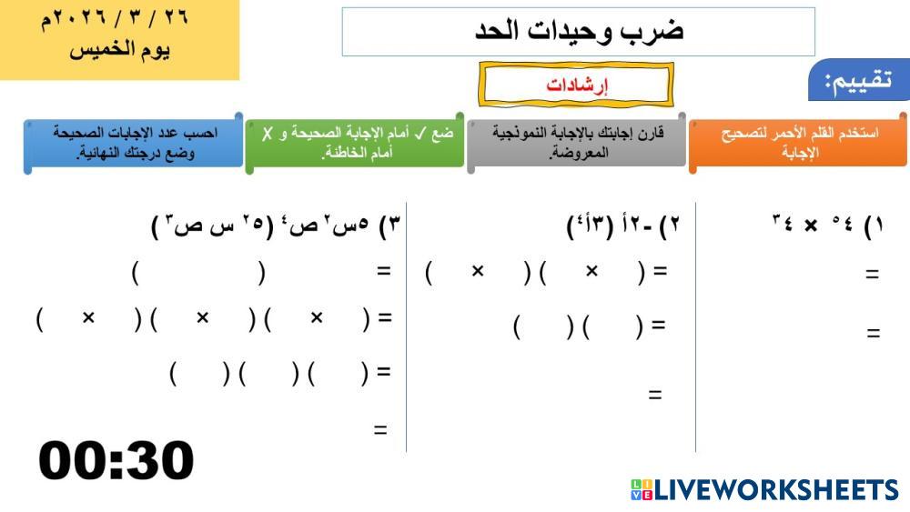 Created byJameel คณิตศาสตร์ มัธยมศึกษาตอนต้น ม.2 (มัธยมศึกษาปีที่ 2) พีชคณิต Arabic คำแนะนำของผู้เขียน تقويم ضرب وحيدات الحد My Google Classroom Courses × 0 classes selected (0 students total) Quick Access Select all classes (0 classes) All Classes Loading courses... ยกเลิก Share Share to selected Course __COURSE_NAME__ __STUDENT_NAME__ (__STUDENT_EMAIL__) تقويم ضرب وحيدات الحد ดาวน์โหลด Worksheet Validation Check my answers Emails my answers to my teacher ชื่อเต็ม Group/level School subject Teacher's email or key code Close ส่งข้อมูล Validating worksheet... (12) Your answers have been sent to your teacher. Good luck! OK We encountered an error submitting your answers. Please try again. OK โฆษณา | ใช้งานแบบไม่มีโฆษณา Created byJameel คณิตศาสตร์ มัธยมศึกษาตอนต้น ม.2 (มัธยมศึกษาปีที่ 2) พีชคณิต Arabic คำแนะนำของผู้เขียน تقويم ضرب وحيدات الحد สำรวจแผ่นงาน การหารากที่สอง Math 8th grade การหารากที่สอง Algebra - Math เติมคำตอบลงในช่องว่าง تجربة Math 8th grade تجربة Algebra - Math جرب حل نظام معادلات خطية بيانيًا Math 8th grade حل نظام معادلات خطية بيانيًا Algebra - Math أجب عن الأسئلة التالية : ضرب وحيدات الحد Math 8th grade ضرب وحيدات الحد Algebra - Math ضرب وحيدات الحد