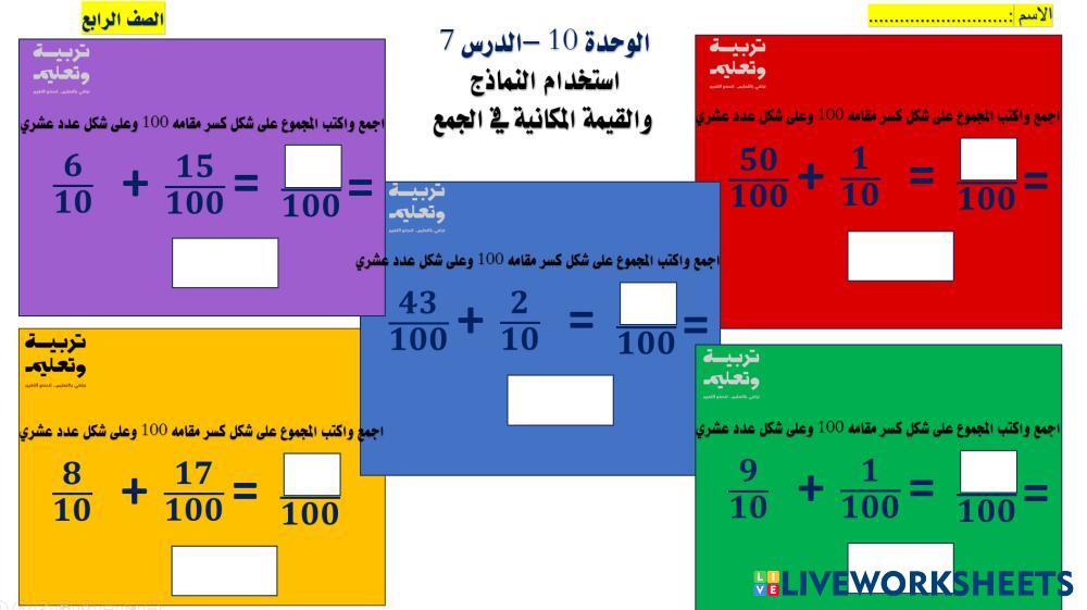 Created by1983 คณิตศาสตร์ ประถมศึกษา ป.4 (ประถมศึกษาปีที่ 4) เศษส่วนและทศนิยม Arabic คำแนะนำของผู้เขียน 11 My Google Classroom Courses × 0 classes selected (0 students total) Quick Access Select all classes (0 classes) All Classes Loading courses... ยกเลิก Share Share to selected Course __COURSE_NAME__ __STUDENT_NAME__ (__STUDENT_EMAIL__) الدرس السابع ดาวน์โหลด Worksheet Validation Check my answers Emails my answers to my teacher ชื่อเต็ม Group/level School subject Teacher's email or key code Close ส่งข้อมูล Validating worksheet... (12) Your answers have been sent to your teacher. Good luck! OK We encountered an error submitting your answers. Please try again. OK โฆษณา | ใช้งานแบบไม่มีโฆษณา Created by1983 คณิตศาสตร์ ประถมศึกษา ป.4 (ประถมศึกษาปีที่ 4) เศษส่วนและทศนิยม Arabic คำแนะนำของผู้เขียน 11 สำรวจแผ่นงาน اجمع. اكتب المجموع على شكل مقام 100. وعلى شكل عدد عشري Math 4th grade اجمع. اكتب المجموع على شكل مقام 100. وعلى شكل عدد عشري Fractions and Decimals - Math ركز يا صغيري أثناء الحل Fracciones Math 4th grade Fracciones Fractions and Decimals - Math Coloca cada dibujo en su fracción correspondiente. استخدام النماذج في الجمع Math 4th grade استخدام النماذج في الجمع Fractions and Decimals - Math اوجد ناتج الجمع حل التمارين الموجهة للدرس الأول Math 4th grade حل التمارين الموجهة للدرس الأول Fractions and Decimals - Math اكتبي الكسر بمقام يساوي 100 ثم قومي بعملية الجمع
