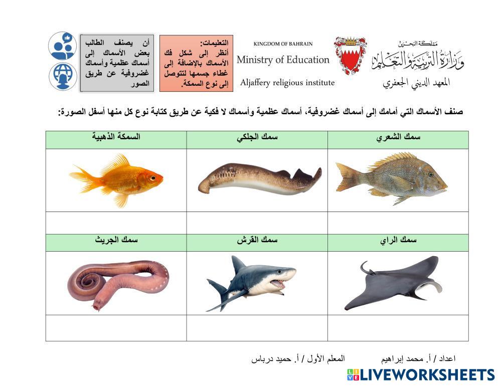 ان يصنف الطالب الأسماك الى أسماك عظمية و أسماك لافكية و أسماك غضروفية