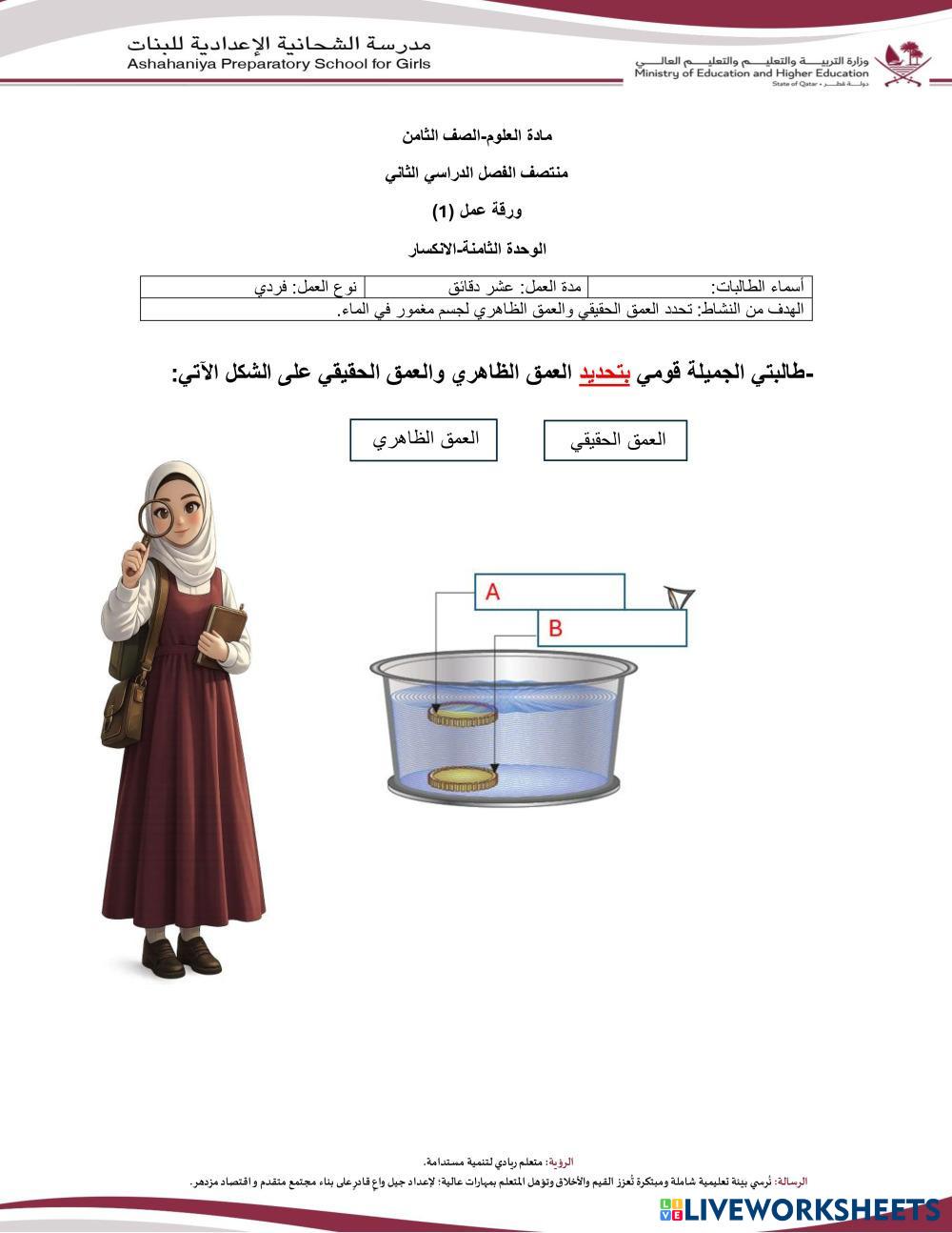 قومي بتحديد العمق الحقيقي والعمق الظاهري على الشكل أدناه