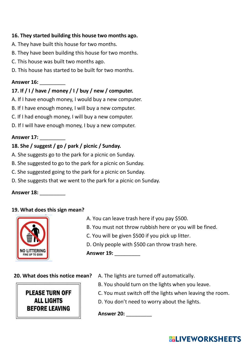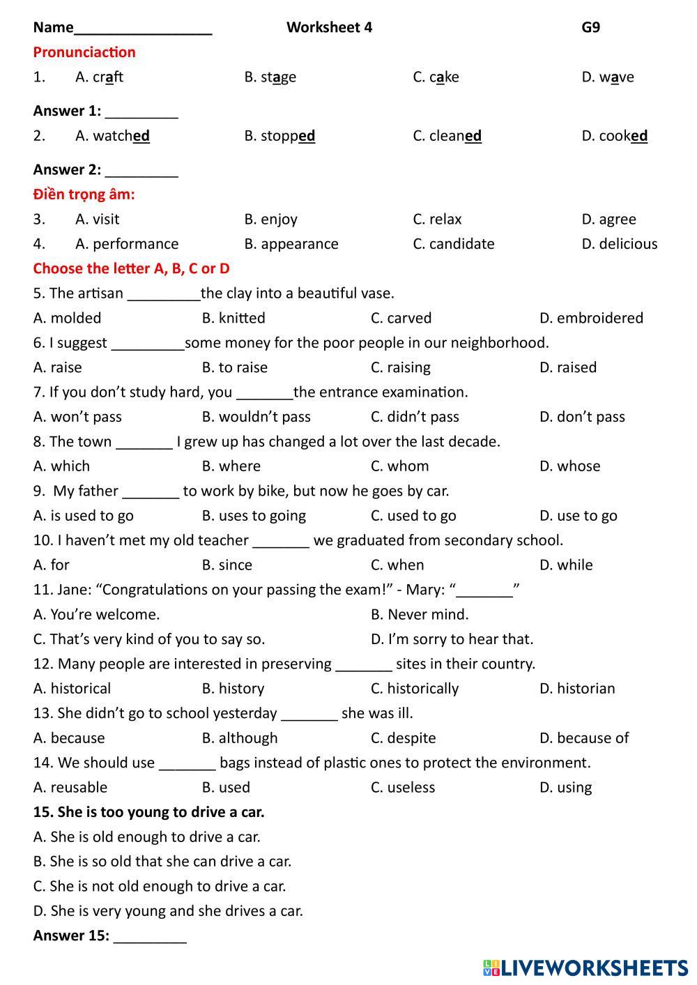 Created by Chettiet ภาษาอังกฤษ มัธยมศึกษาตอนปลาย ม.3 (มัธยมศึกษาปีที่ 3) การเขียน Aymara คำแนะนำของผู้เขียน Bác Huyền My Google Classroom Courses × 0 classes selected (0 students total) Quick Access Select all classes (0 classes) All Classes Loading courses... ยกเลิก Share Share to selected Course __COURSE_NAME__ __STUDENT_NAME__ (__STUDENT_EMAIL__) Worksheet 4 - Grade 9 ดาวน์โหลด Worksheet Validation Check my answers Emails my answers to my teacher ชื่อเต็ม Group/level School subject Teacher's email or key code Close ส่งข้อมูล Validating worksheet... (12) Your answers have been sent to your teacher. Good luck! OK We encountered an error submitting your answers. Please try again. OK โฆษณา | ใช้งานแบบไม่มีโฆษณา Created by Chettiet ภาษาอังกฤษ มัธยมศึกษาตอนปลาย ม.3 (มัธยมศึกษาปีที่ 3) การเขียน Aymara คำแนะนำของผู้เขียน Bác Huyền สำรวจแผ่นงาน be able to (unit 6) English Language 9th grade be able to (unit 6) Writing - English Language Grammar A1 UNIT 1 ACTIVITY English Language 9th grade A1 UNIT 1 ACTIVITY Writing - English Language Read the instructions carefully and complete all the exercises. Revision Unit 6 Future will English Language 9th grade Revision Unit 6 Future will Writing - English Language Grammar WORKSHOP LEVEL III B2 English Language 9th grade WORKSHOP LEVEL III B2 Writing - English Language This is a review of the contents of units 4,5 and 6 from the book Evolve 2A.
