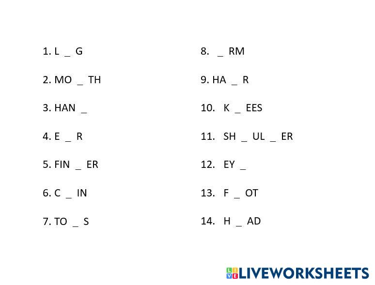 Created byNikol Kalinová ESL English A1 (เริ่มต้น) คำศัพท์ Czech คำแนะนำของผู้เขียน Doplň chybějící písmena do slov. My Google Classroom Courses × 0 classes selected (0 students total) Quick Access Select all classes (0 classes) All Classes Loading courses... ยกเลิก Share Share to selected Course __COURSE_NAME__ __STUDENT_NAME__ (__STUDENT_EMAIL__) Body parts ดาวน์โหลด Worksheet Validation Check my answers Emails my answers to my teacher ชื่อเต็ม Group/level School subject Teacher's email or key code Close ส่งข้อมูล Validating worksheet... (12) Your answers have been sent to your teacher. Good luck! OK We encountered an error submitting your answers. Please try again. OK โฆษณา | ใช้งานแบบไม่มีโฆษณา Created byNikol Kalinová ESL English A1 (เริ่มต้น) คำศัพท์ Czech คำแนะนำของผู้เขียน Doplň chybějící písmena do slov. สำรวจแผ่นงาน Numbers 1-20 ESL A1 Numbers 1-20 Vocabulary - ESL English as a second language Number the words under the pictures Main content: Numbers I07 U9 Rules and Regulations ESL A1 I07 U9 Rules and Regulations Vocabulary - ESL . BASIC VOCABULARY STARTER OWN IT 1 ESL A1 BASIC VOCABULARY STARTER OWN IT 1 Vocabulary - ESL Circle the next month. Complete the table with the numbers. Complete the nationalities. Use the endings in the box. Are these classroom objects in the picture? Write Yes or No. Complete the sentences about the picture. Vocabulary: Adjectives | Function: Asking for opinion and description ESL A1 Vocabulary: Adjectives | Function: Asking for opinion and description Vocabulary - ESL 1. Write the numbers in the correct positions 2. Open answers. Check with the teacher when you finish.