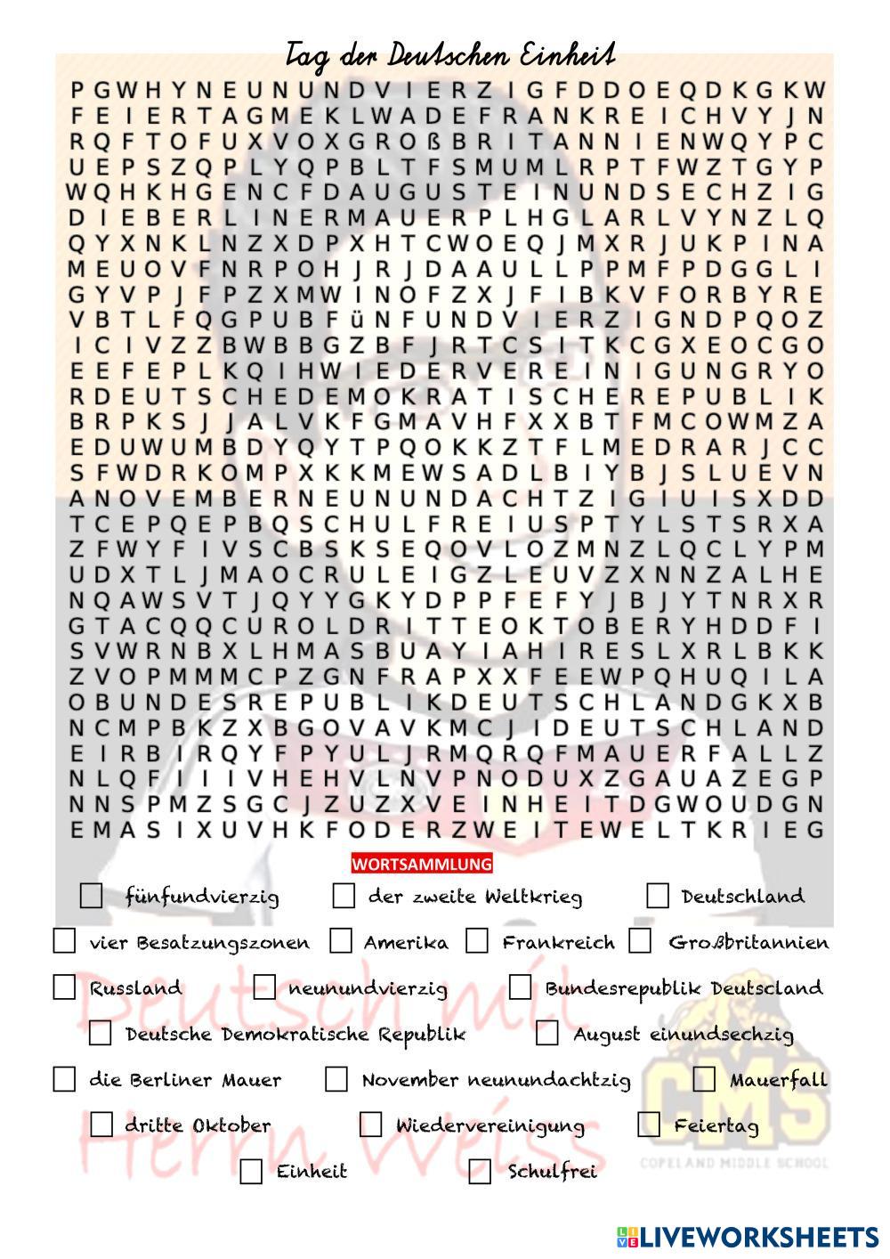 Find and highlight the "Day of German Unity" vocabulary. Once you highligt a word, choose "ja" in the box next to the word in the WORTSAMMLUNG section to help you remember you have found and highlighted that word. The word "Deutschland" is in the word search twice because it is a word by itself and is also a part of another phrase.