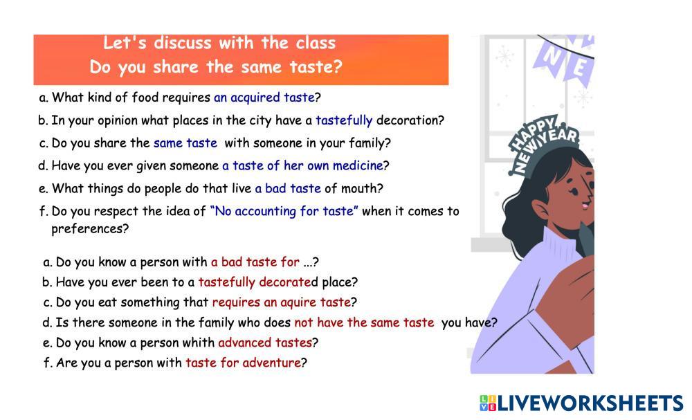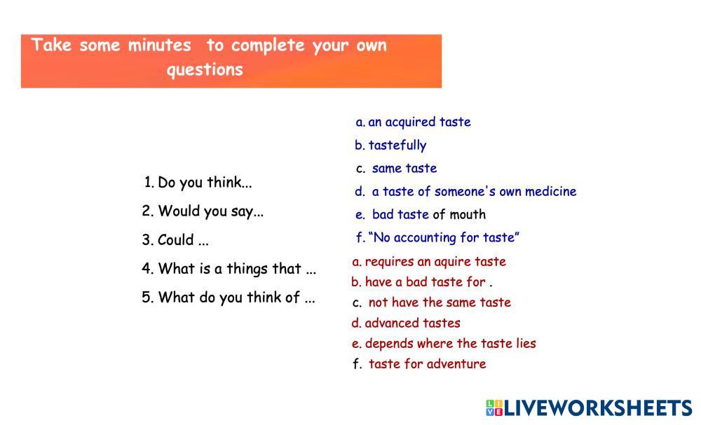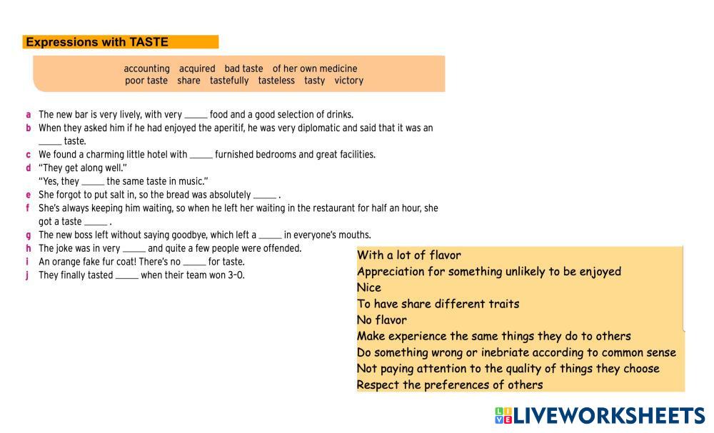 Created byKaren Gabriela Sagastume Morales Conversation Vocabulary Age 18+ level: Conversation Strategies English คำแนะนำของผู้เขียน My Google Classroom Courses × 0 classes selected (0 students total) Quick Access Select all classes (0 classes) All Classes Loading courses... ยกเลิก Share Share to selected Course __COURSE_NAME__ __STUDENT_NAME__ (__STUDENT_EMAIL__) TASTE ดาวน์โหลด Worksheet Validation Check my answers Emails my answers to my teacher ชื่อเต็ม Group/level School subject Teacher's email or key code Close ส่งข้อมูล Validating worksheet... (12) Your answers have been sent to your teacher. Good luck! OK We encountered an error submitting your answers. Please try again. OK โฆษณา | ใช้งานแบบไม่มีโฆษณา Created byKaren Gabriela Sagastume Morales Conversation Vocabulary Age 18+ level: Conversation Strategies English คำแนะนำของผู้เขียน
